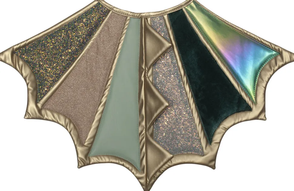 Dragevinger med dramatiske detaljer, elastikstrop, glitter og gyldent kantbånd.