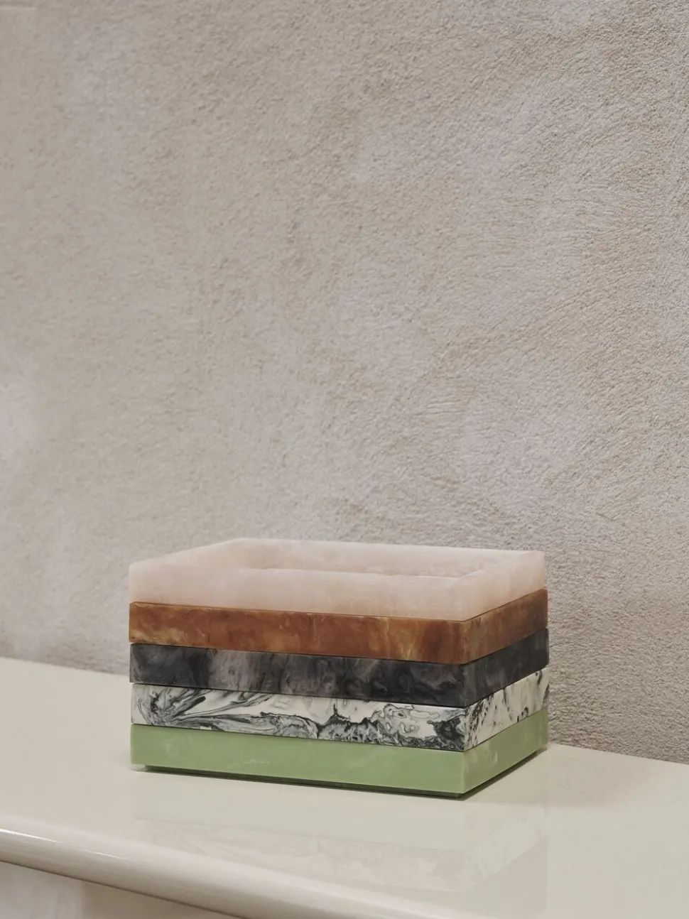 Mist serien er en sofistikeret blanding af legende geometri og funktionelt design. Alle dele i denne finurlige serie giver dig mulighed for at skabe din egen unikke kombination med indbyrdes forbundne former, som kan stables. Mist Bakken er fremstillet af en resinblanding og har flydende, hvirvlende former og æteriske toner, som gør hver enkelt bakke helt unik. Bakken er perfekt til at rumme plejeprodukter, tilbehør og andre skatte, og den passer nemt ind i alle hjemmets rum. Mist Bakken fås i forskellige størrelser, sælges separat og opfylder en række opbevaringsbehov i hjemmet med elegance og stil.