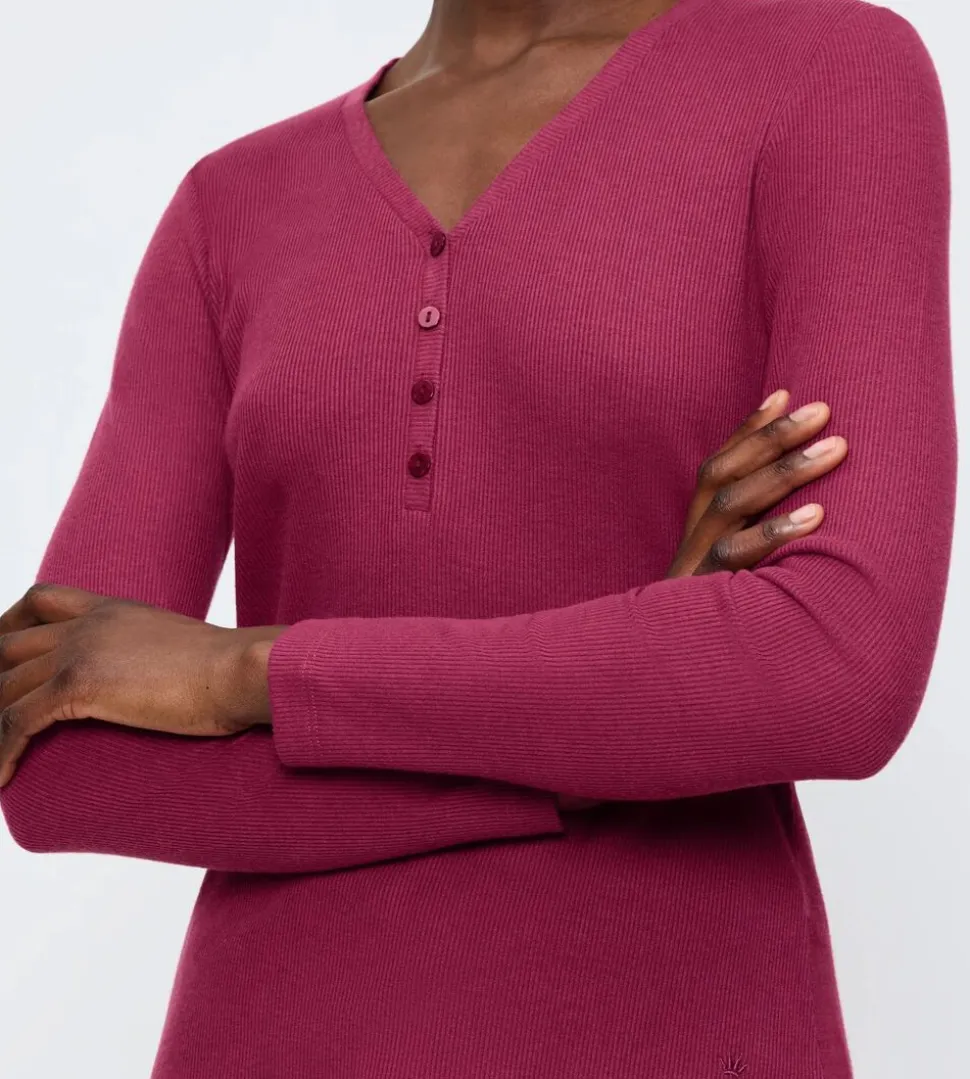 Denne langærmede top kombinerer komfort og stil med en alsidig V-udskæring og justerbar knaplukning. Den er fremstillet af en blød, børstet stofblanding af 61 % genbrugspolyester og 33 % certificeret Lenzing-viskose, som sikrer varme og komfort.