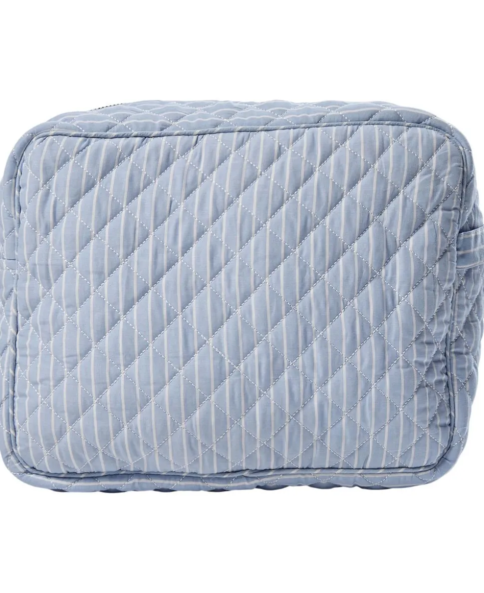 Toilettaske fra Magasin du Nord Collection i den blødeste kvalitet af 80% økologisk bomuld med GOTS-certificering. Toilettasken består af ét stort rum med lynlåslukning samt mindre inderlommer. Derudover har toilettasken fine vatterede syningsdetaljer og et stribet print. En skøn toilettaske i den lækreste kvalitet.