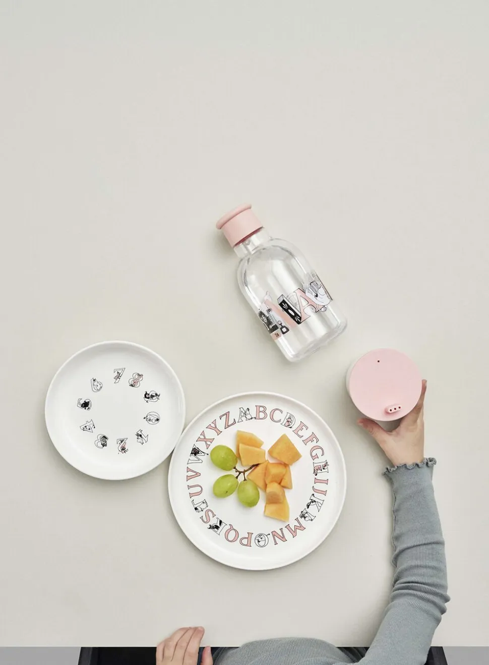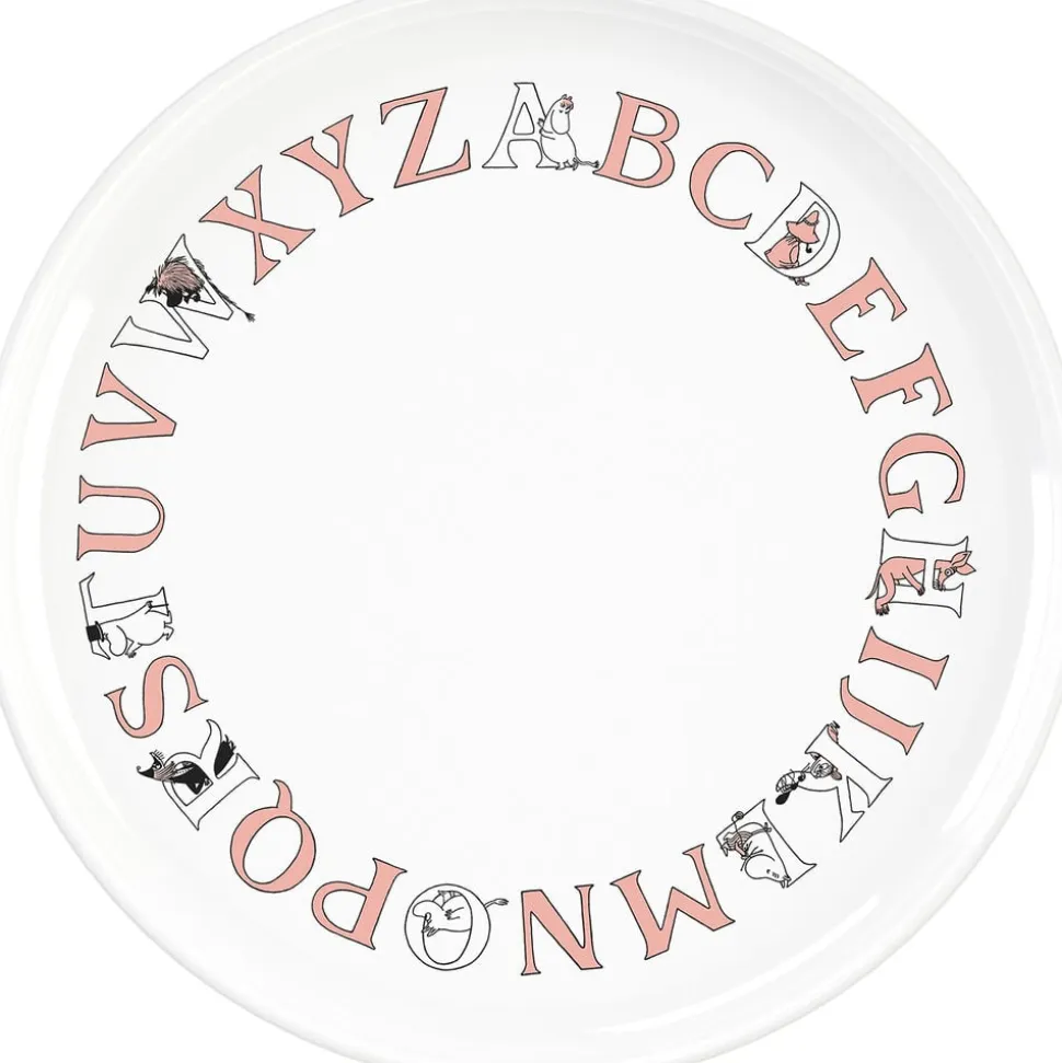 At kunne udtrykke sig er en af de vigtigste ting i verden: det giver mulighed for at kommunikere håb og drømme, forholde sig til andre, engagere sig i vor tids store spørgsmål og skabe forandringer. Alfabetet, der er designet til Moomin ABC kollektionen, er alle baseret på Tove Janssons originale bogstaver. Moomin ABC tallerkenen er udviklet specielt til små hænder, med bløde former, der gør den let at holde fast i for børn. De bløde former gør det desuden let for de helt mindste selv at kunne få fat om maden med hænderne langs kanten. Grafikken inspirerer til leg med ord og kan hjælpe med at vække barnets interesse for bogstaver. Tallerkenen fås med alfabetet i farverne salmon eller turquoise. Tallerkenen er lavet af PP plast som er et særdeles holdbart og børnevenligt materiale. Den tåler både mikrobølgeovn og opvaskemaskine og er naturligvis fri for BPA, phtalater og andre skadelige stoffer.