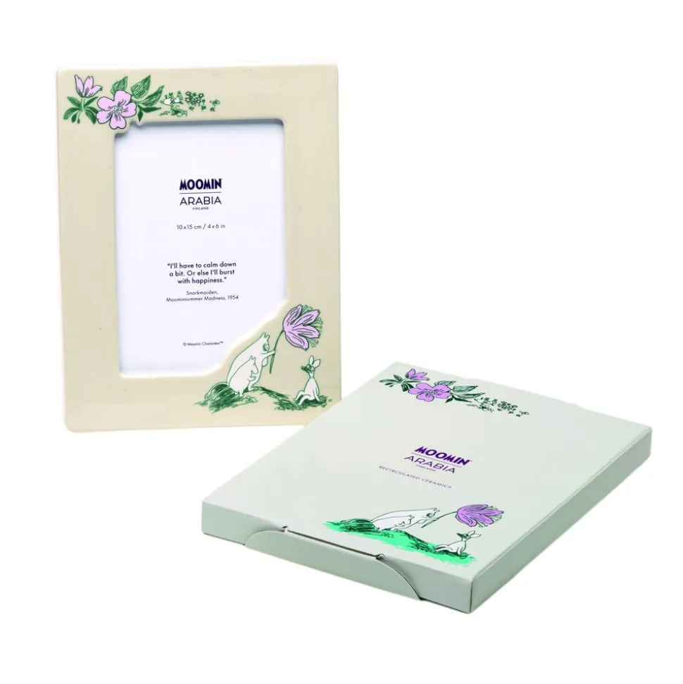Tilføj Moomin magi til dit hjem med en smuk fotoramme, fremstillet af Recycled keramik. Design er inspireret af Tove Janssons første Moomin-fortælling, The Moomins and the Great Flood. De håndtegnede illustrationer tager dig med på Moomins’ søgen efter at finde deres hjem. Moomin Arabia fotoramme 10 x 15 cm, Wildflower Recycled