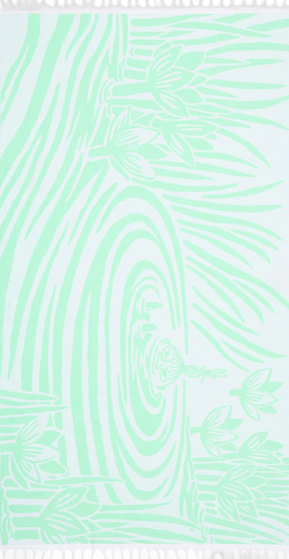 Denne flotte strandtekstilkollektion er perfekt til en dag ved vandet. Grib din Mumi-strandtaske, og sæt kurs mod stranden! Moomin Arabia-hammamhåndklæde 80×150 cm, Stranddag GOTS