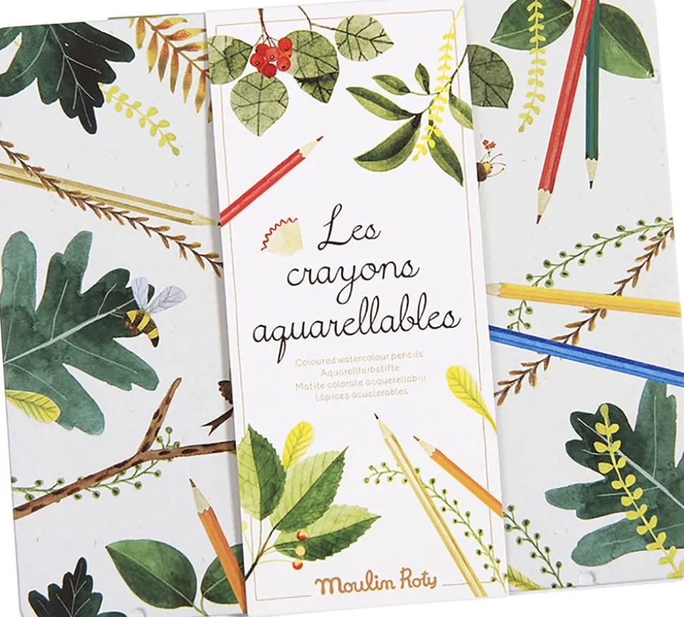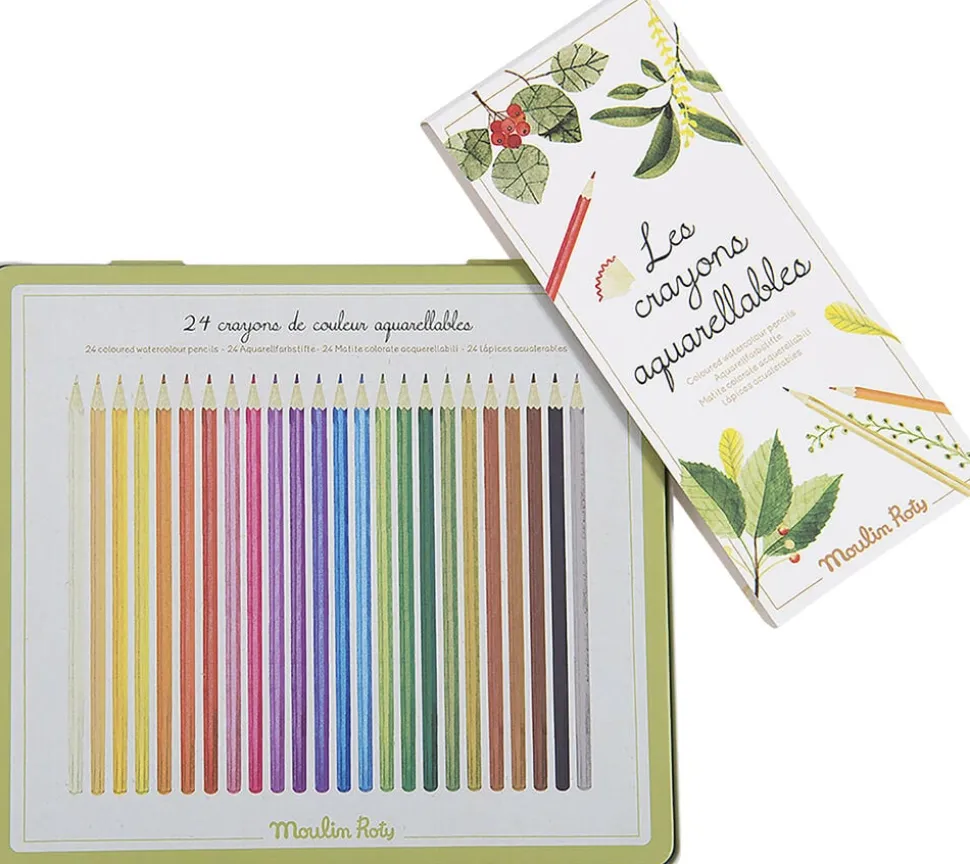 24 akvarel farveblyanter i lyse farver leveres i en metalæske med fine illustrationer.
