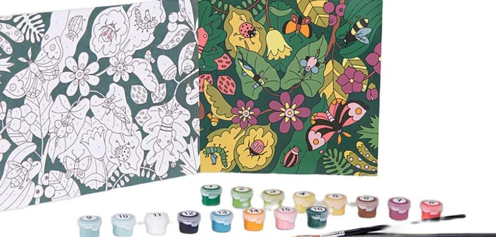 Indhold: 3 x lærreder (22×18 cm), 2 x pensler, 16 x små bøtter maling.