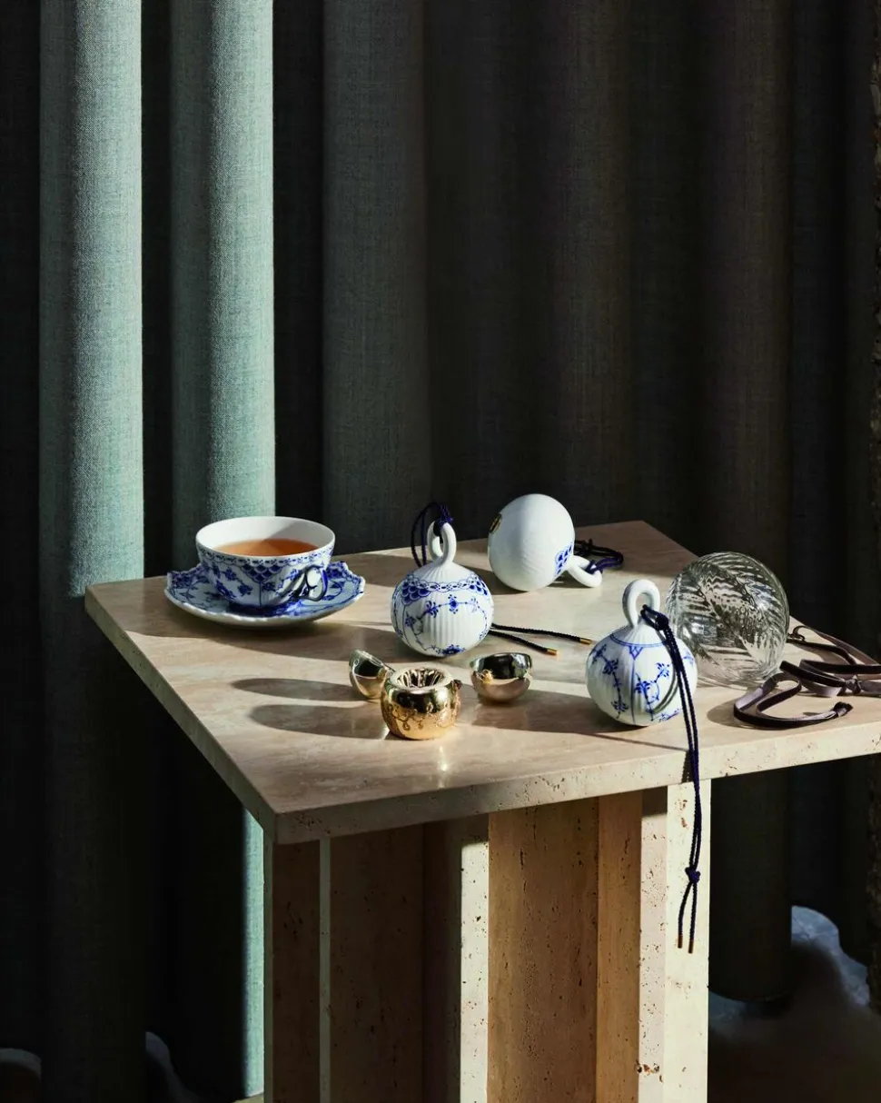 Royal Copenhagens porcelænsjulekugler er perfekte samlerobjekter. Den smukke julekugle er håndmalet med det klassiske mønster fra Musselmalet Halvblonde, og sammen med de andre julekugler fra Royal Copenhagen, er den smuk på juletræet eller hængende fra en gren i vindueskarmen.