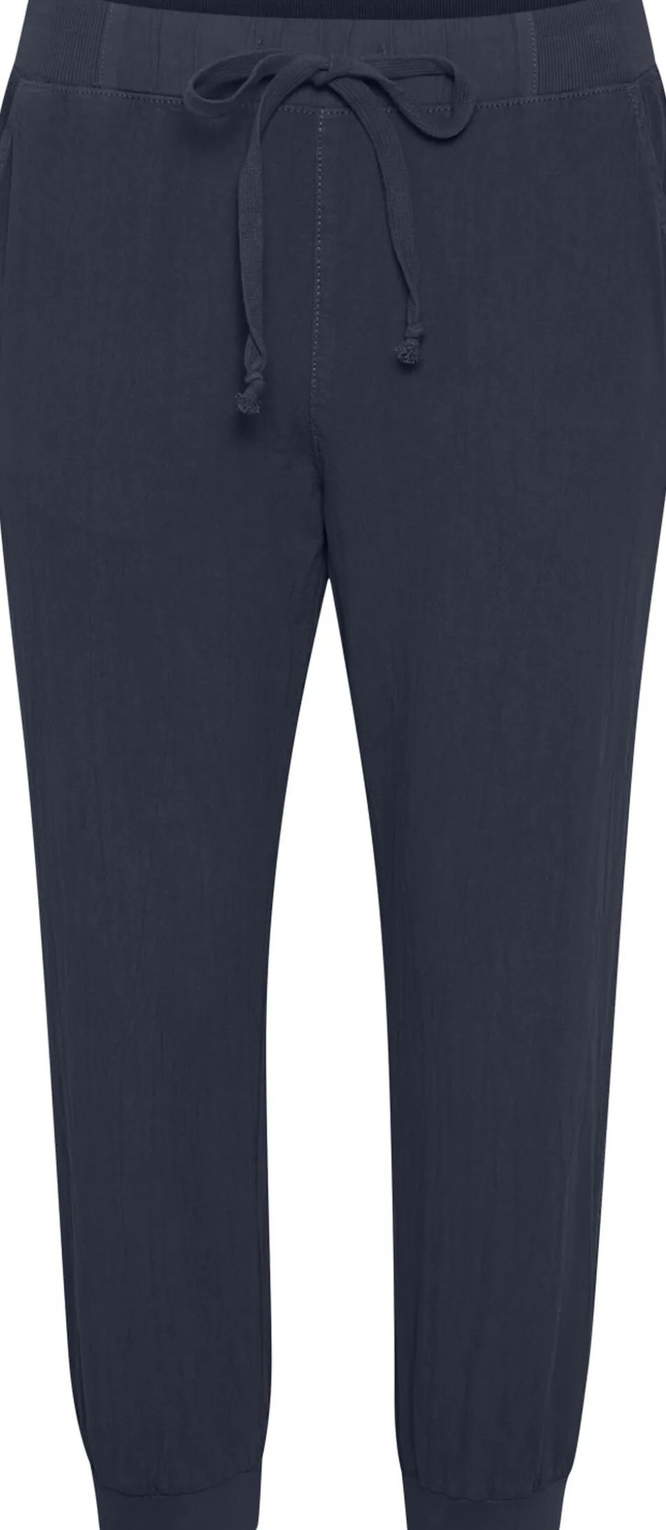 Virkelig behagelige cropped bukser fra KAFFE Bukserne har en længde til under knæet med ribkant Bukserne har derudover en lækker 1 bomuldskvalitet elastikkant med snore og et regular fit Det er uden tvivl en buks som ud over dens behagelighed