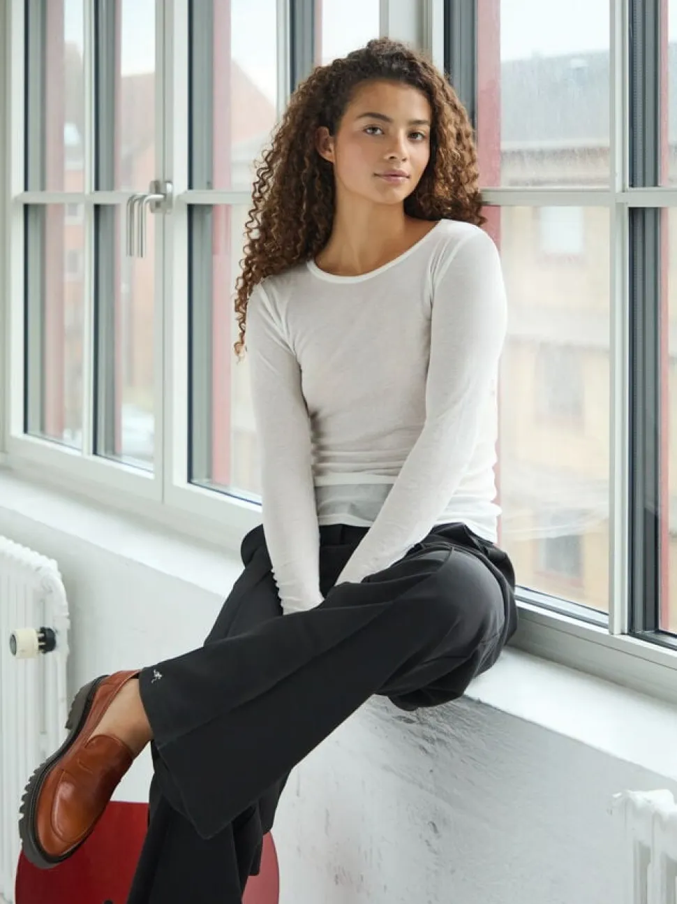Langærmet bluse i en blød ribkvalitet. Blusen har en rund halsudskæring og en tætsiddende pasform. Den er lavet i en blød lyocell- og uldblanding. Modellen er iført størrelse 36.