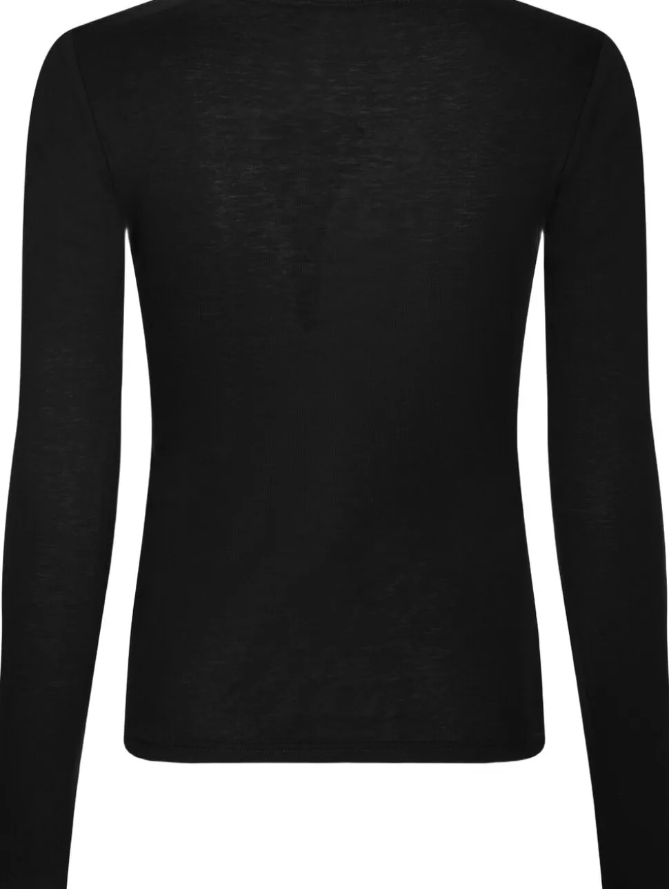 Langærmet bluse i en blød ribkvalitet. Blusen har en rund halsudskæring og en tætsiddende pasform. Den er lavet i en blød lyocell- og uldblanding. Modellen er iført størrelse 36.