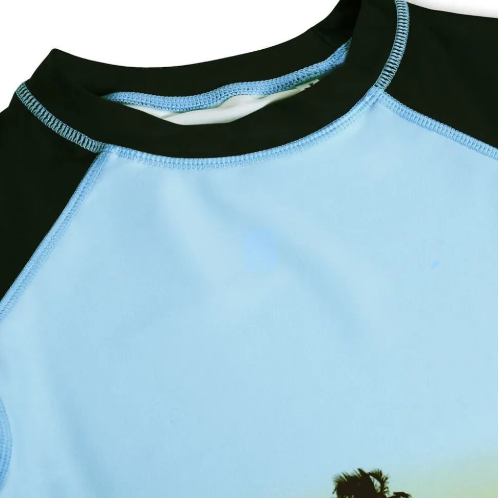Badeblusen til aktive børn byder på en tætsiddende pasform og opstående krave med lange raglanærmer. Den er designet til strand og pool med sit strækbare materiale, der sikrer høj komfort. Fremstillet af genanvendt polyester tilbyder blusen også beskyttelse mod UV-stråler med 50+, hvilket gør den ideel til sjov i solen.