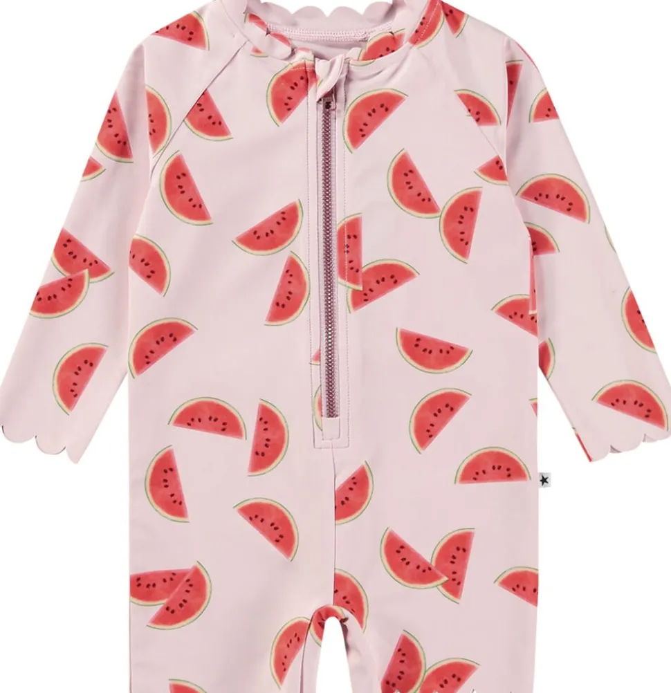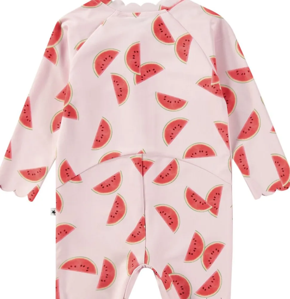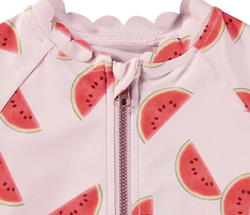 Badedragt med lange ærmer og korte ben til de mindste, fremstillet af genanvendt polyester og med UV-beskyttelse 50+. Den har en lynlås foran, der gør den nem at tage af og på. Dragten er prydet med bløde bølgekantede detaljer og har god plads til en ble.
