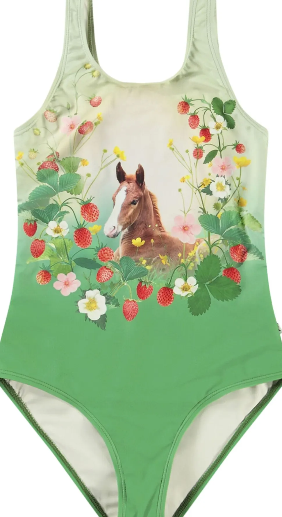 Lyserød badedragt med smilende smiley-print på forsiden. Lavet af genanvendt, elastisk polyester for komfort og nem påklædning. Med en høj UV-beskyttelse på 50+ er den ideel til solbeskyttelse.