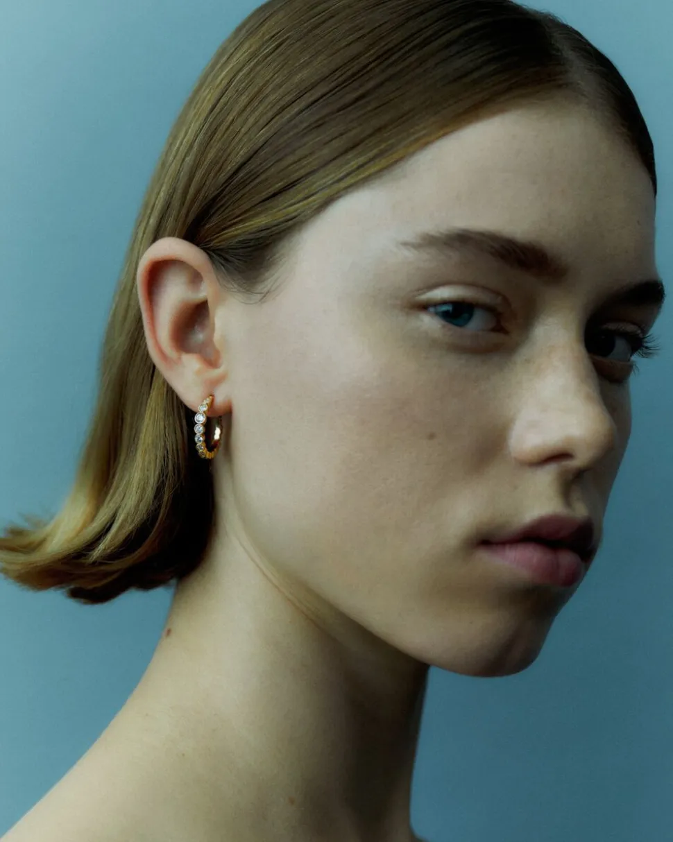 Et par mellemstore hoops, lavet i 925 sterling sølv og udsmykket med glitrende cubic zirconia-sten i forskellige størrelser.