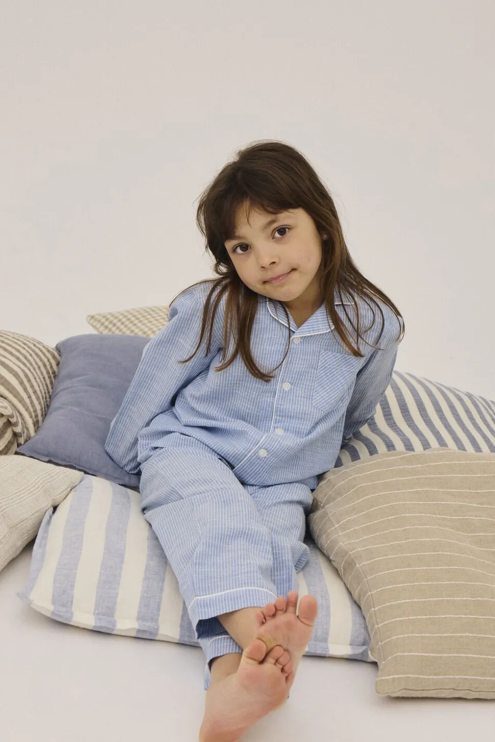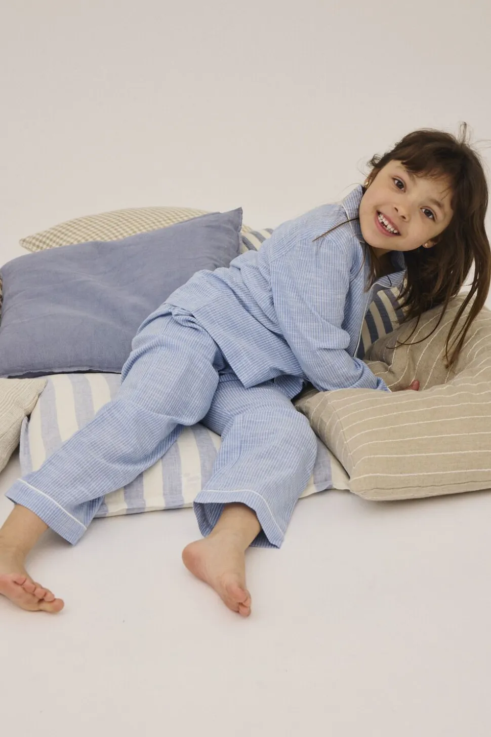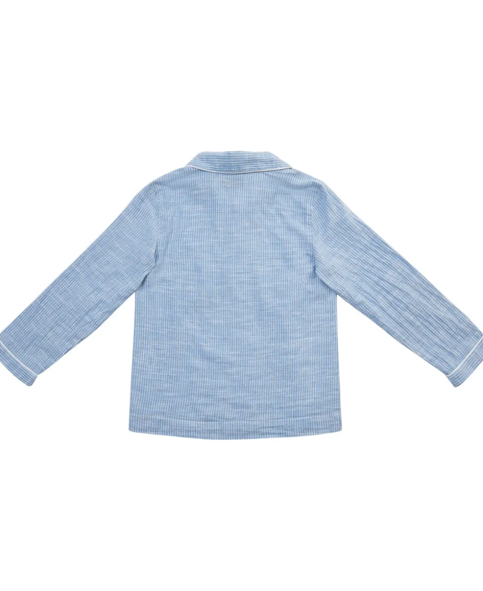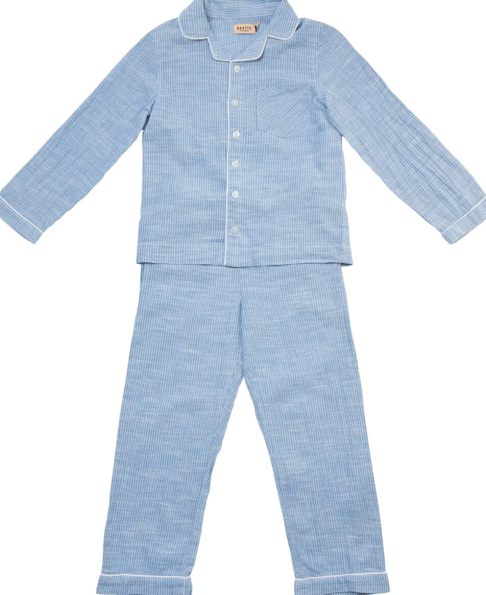 Pyjamassæt fra Magasin du Nord Collection i en blød kvalitet af 100% økologisk, GOTS-certificeret bomuld med et stribet mønster. Sættet består af bukser og skjorte. Bukserne har sidelommer samt elastik og en justerbar snøre i taljen. Skjorten har knaplukning på fronten, brystlomme samt en sød krave med ‘piping’-detaljer. Økologisk bomuld kommer fra landbrug, hvor man arbejder med naturen på en måde så både økosystemer og biodiversitet opretholdes. Det betyder, at der ikke benyttes giftige kemikalier, at vandforbruget begrænses og at der i højere grad anvendes regnvand i produktionen. Når du vælger økologisk bomuld, er du derfor med til at værne om jordens ve og vel. Bakito skifter navn til Magasin du Nord Collection nyt navn og samme gode produkter. Vores egen børnekollektion er fortsat udviklet ud fra ambitionen om, at vi vil give børn behagelige hverdagsfavoritter i lækre bløde økologiske og recyclede kvaliteter, som er produceret med respekt for mennesker og natur.