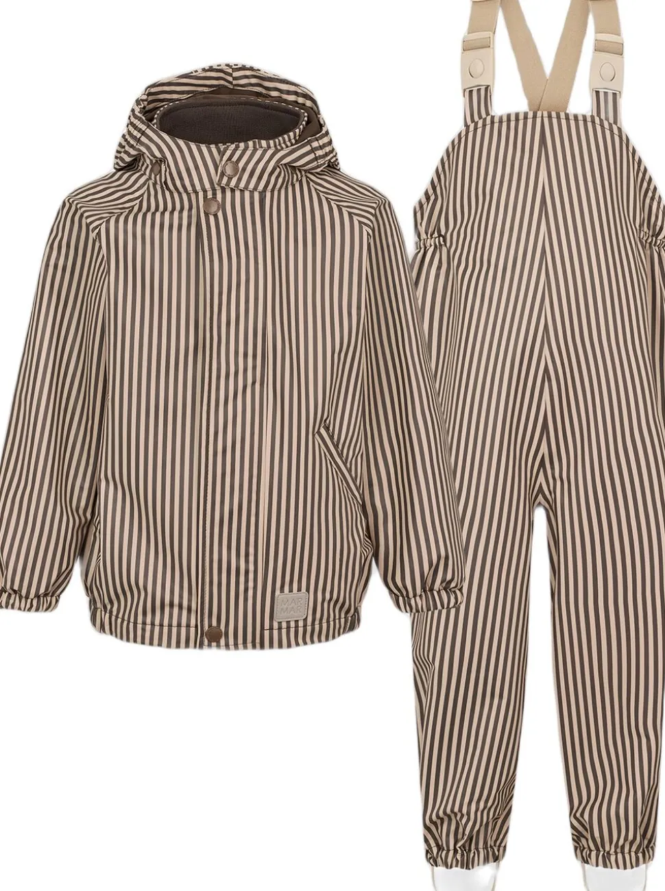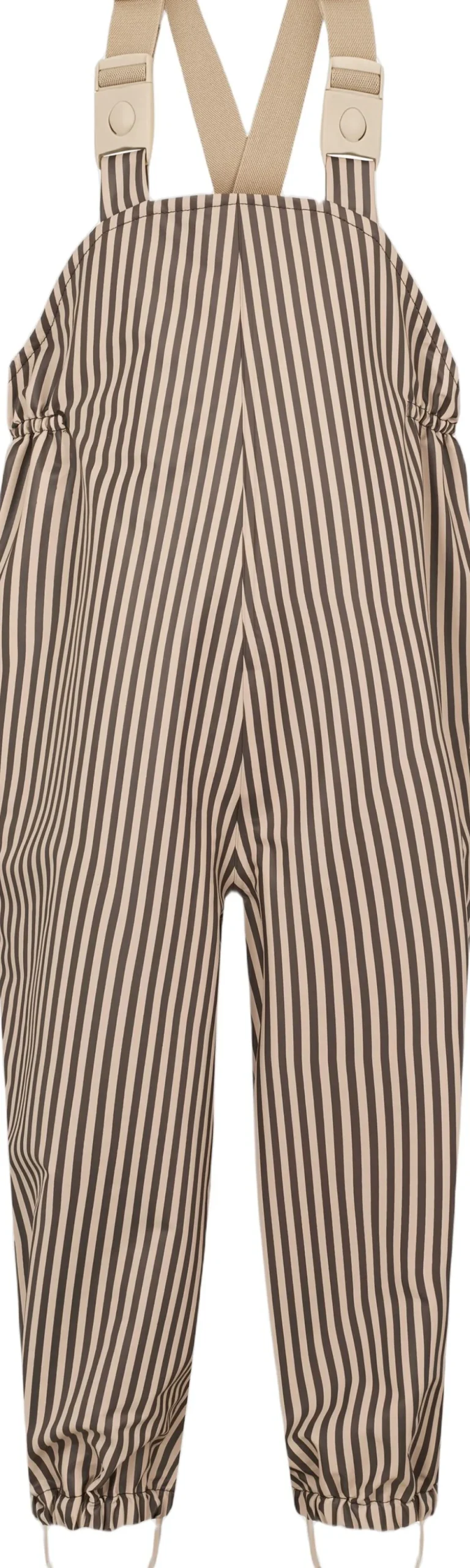 Regnsæt til de mindste. Regnbukserne har justerbare seler og har elastik i siderne for at sikre den bedste pasform. Regnbukserne har praktiske fodstropper som sørger for, at bukserne bliver siddende over støvlerne, så der ikke kommer vand ind. Jakken har en lomme foran og lukkes med lynlås og trykknapper. Jakken har en aftagelig hætte, der kan fjernes efter behov, og elastiske manchetter ved ærmerne, som sikrer en tætsiddende pasform og forhindrer vand i at trænge ind.