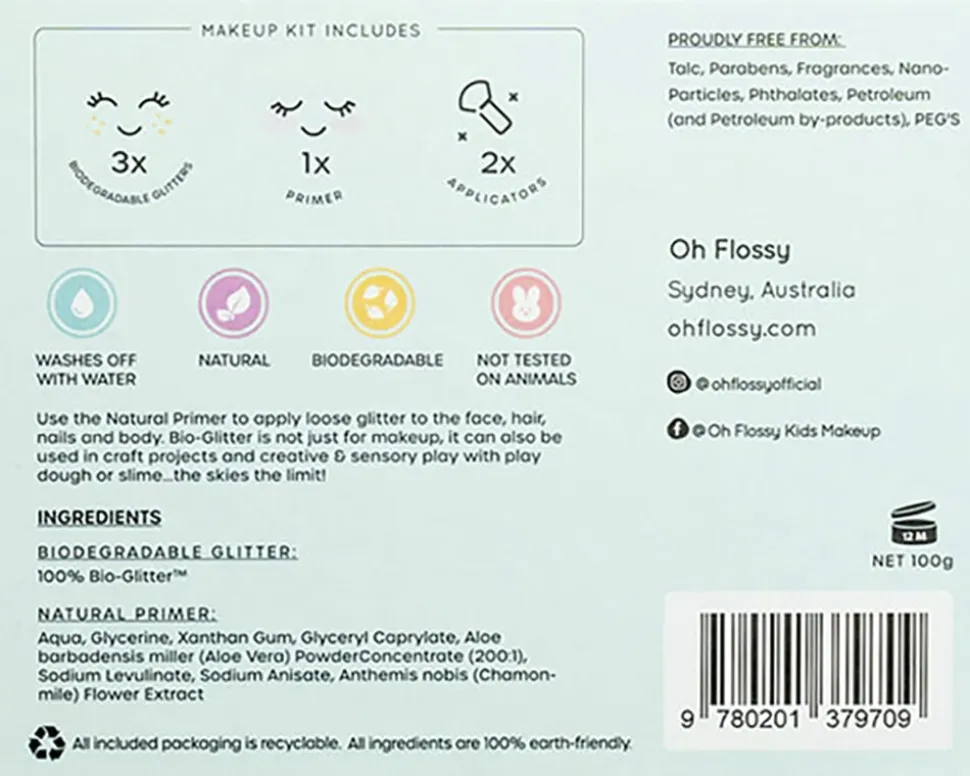 Et festligt glittersæt med 3 farver biologisk nedbrydeligt glimmer, 1 primer og 2 applikatorer.