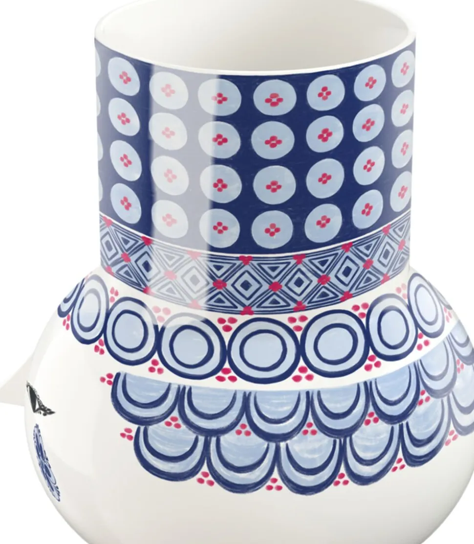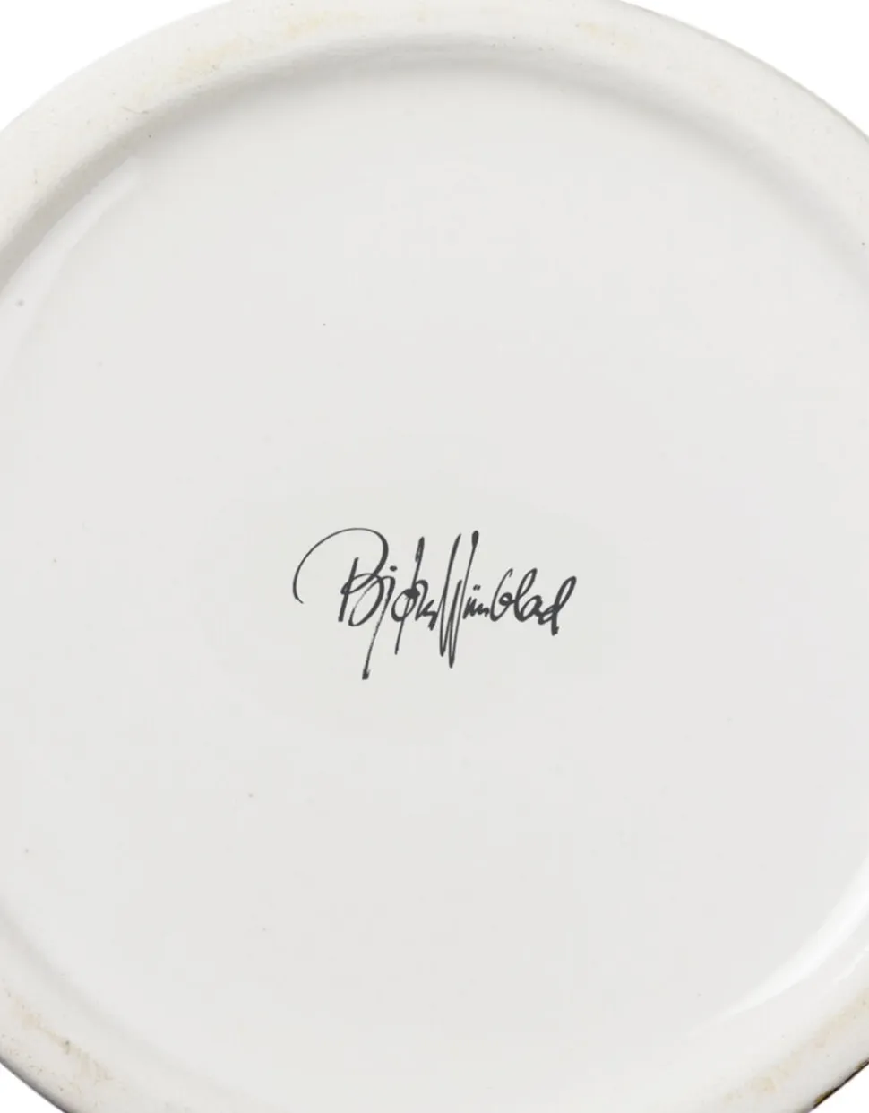 Udfold din farverige personlighed og lad kreativiteten blomstre med Bjørn Wiinblads Olga. Med sit glade smil, de blussende kinder og farverige dekorationer rummer Olga på alle måder essensen af Bjørn Wiinblad som person og kunstner også når hun tager form som vase. Glad og drømmende skaber hun liv og personlighed i indretningen med sit poetiske udtryk og sine sprudlende farver. Olga-vasen er en nyfortolkning af en ikonisk vase, som Bjørn Wiinblad lavede i samarbejde med den keramiske fabrik Nymølle. Den har den samme cylindriske top som vasen fra Bjørn Wiinblads imponerende designarkiv og prydes af et sødt rundt ansigt med de mandelformede øjne og den ikoniske trekantede næse, der nok nærmest er selve personificeringen af Bjørn Wiinblads kunst. Seriens vase i mellemstørrelsen på 20 cm i højden kommer i en klassisk mørkeblå farve i kombination med rubinrøde prikker. Alle Olga-vaser er lavet af skinnende glaseret keramik med farverige decals, og dekorationerne er en skøn blanding af originale Bjørn Wiinblad-mønstre, der i en skøn varieret farvepalet giver dig et moderne og friskt udtryk. Bjørn Wiinblad var en livsglad kunstner med en stor og farverig personlighed, der gik sine egne veje og ikke var bange for at drømme og tænke stort. Den sjæl mærkes også til fulde i Olga, der hviler i sig selv og inviterer os til at udtrykke vores egen stil og personlighed i indretningen med farverige blomsterbuketter, eksotiske planter og kreative dekorationer. En ting er sikkert: Det bliver ikke kedeligt, når Olga flytter ind.
