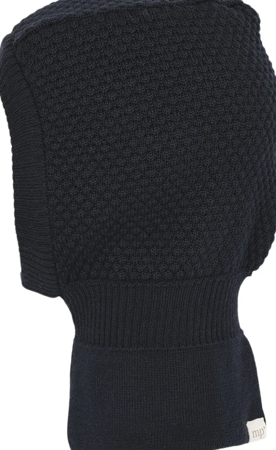 Uldbalaclava med strukturmønster og windstopper ved ørerne.