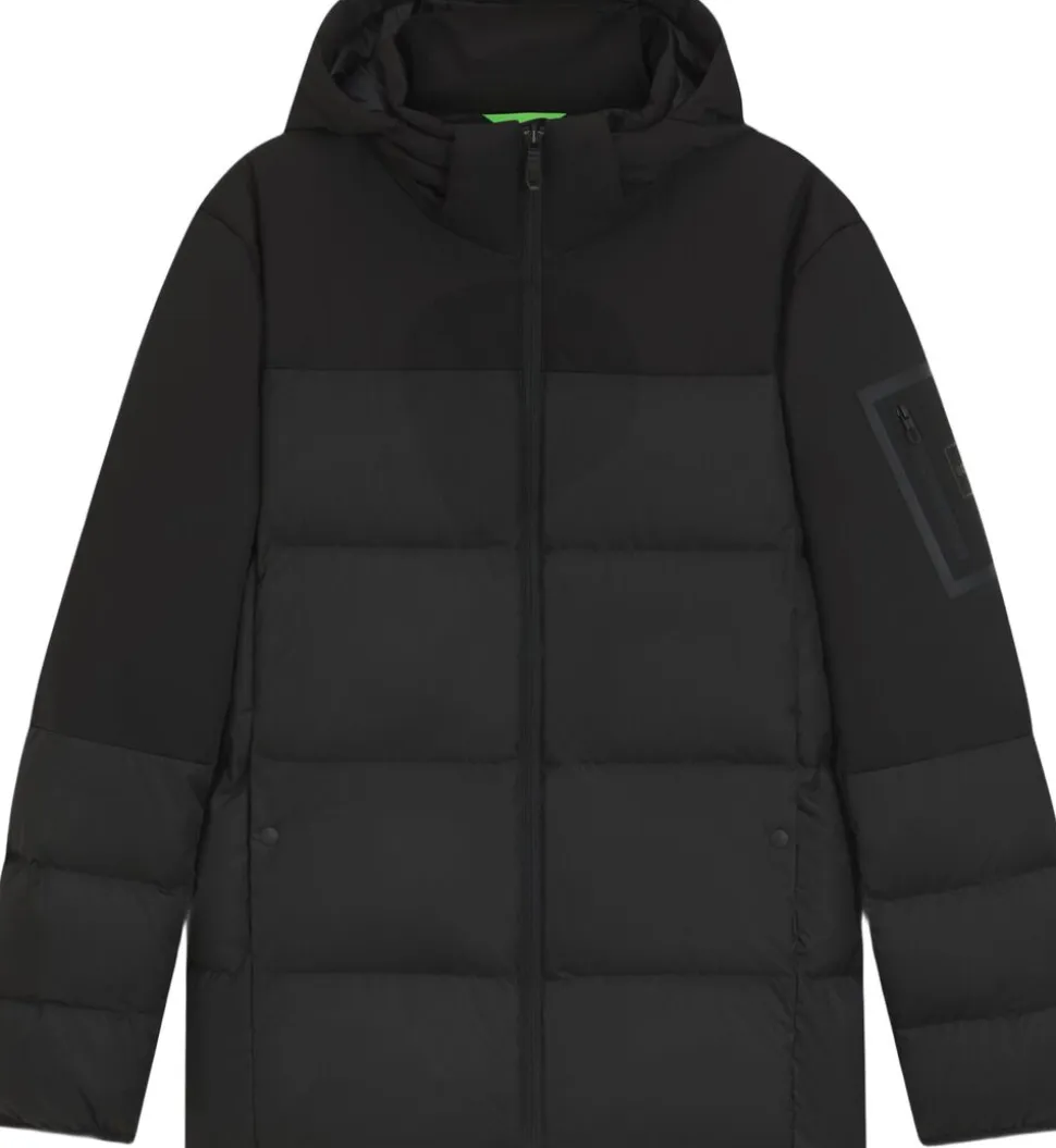 Denne behagelige og vandafvisende jakke fra BOSS herretøj har en ikonisk ærmelomme med mærke. Certificeret dun- og fjerfyldning. Sikker inderlomme med lynlås