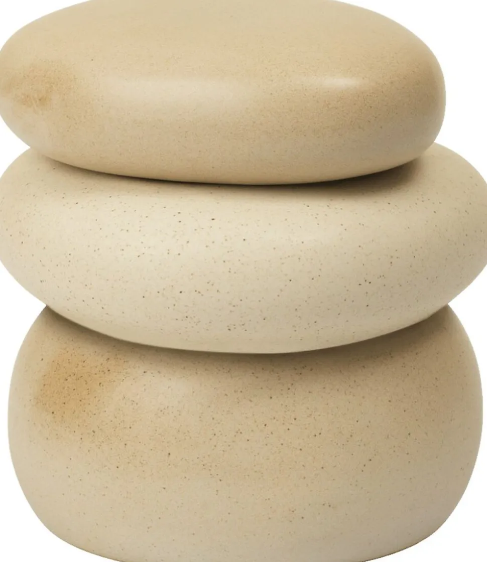 Pebble Boks er inspireret af den naturlige skønhed ved stablede småsten langs kysten, og hver boks efterligner småstenens glatte, afrundede former. Den er fremstillet af glaseret keramik og har en slank, poleret finish, der fremhæver designets elegance og beroligende virkning. Pebble Boks fås i forskellige størrelser og kan udstilles enkeltvis eller stables sammen for et dynamisk, look i flere lag.