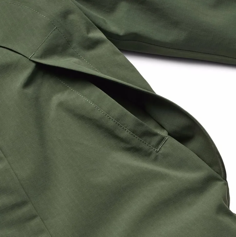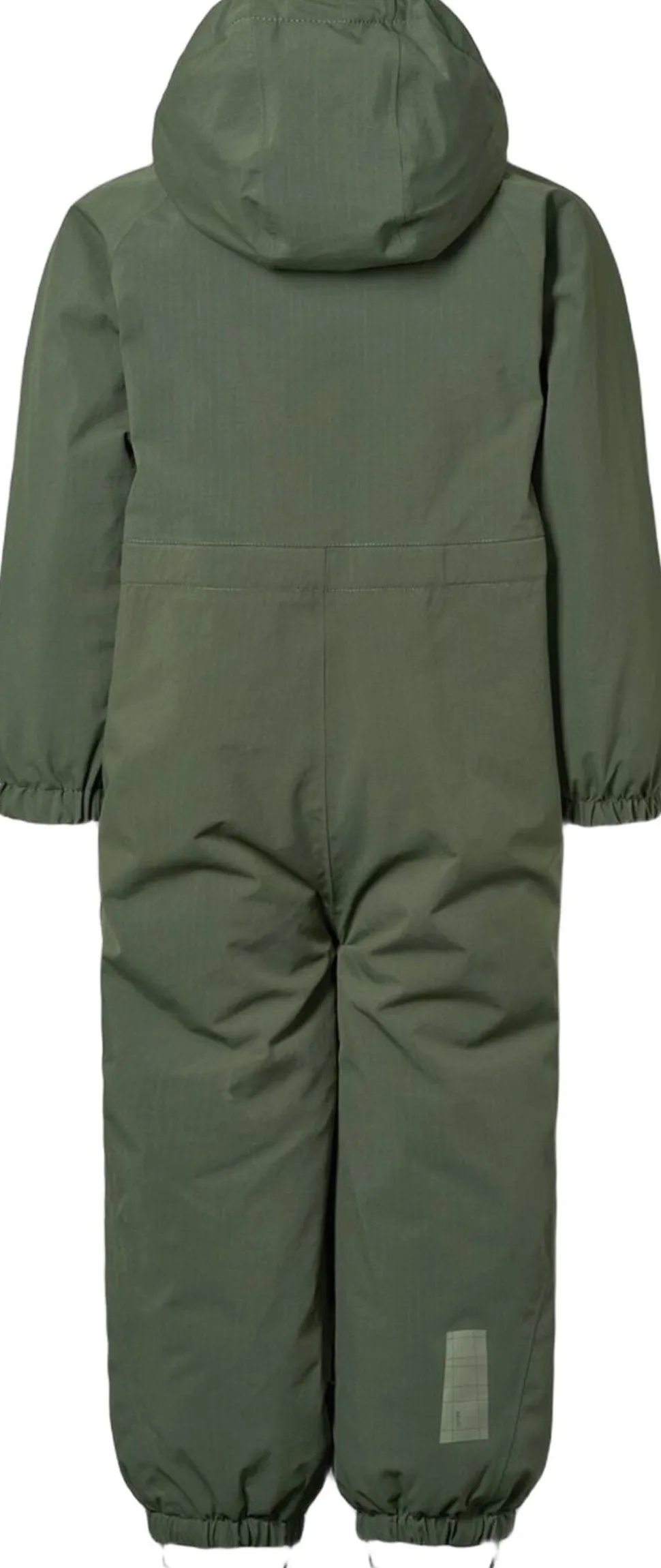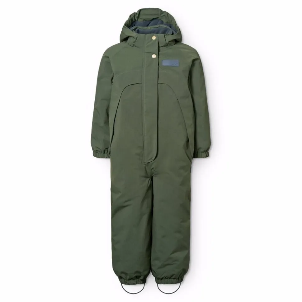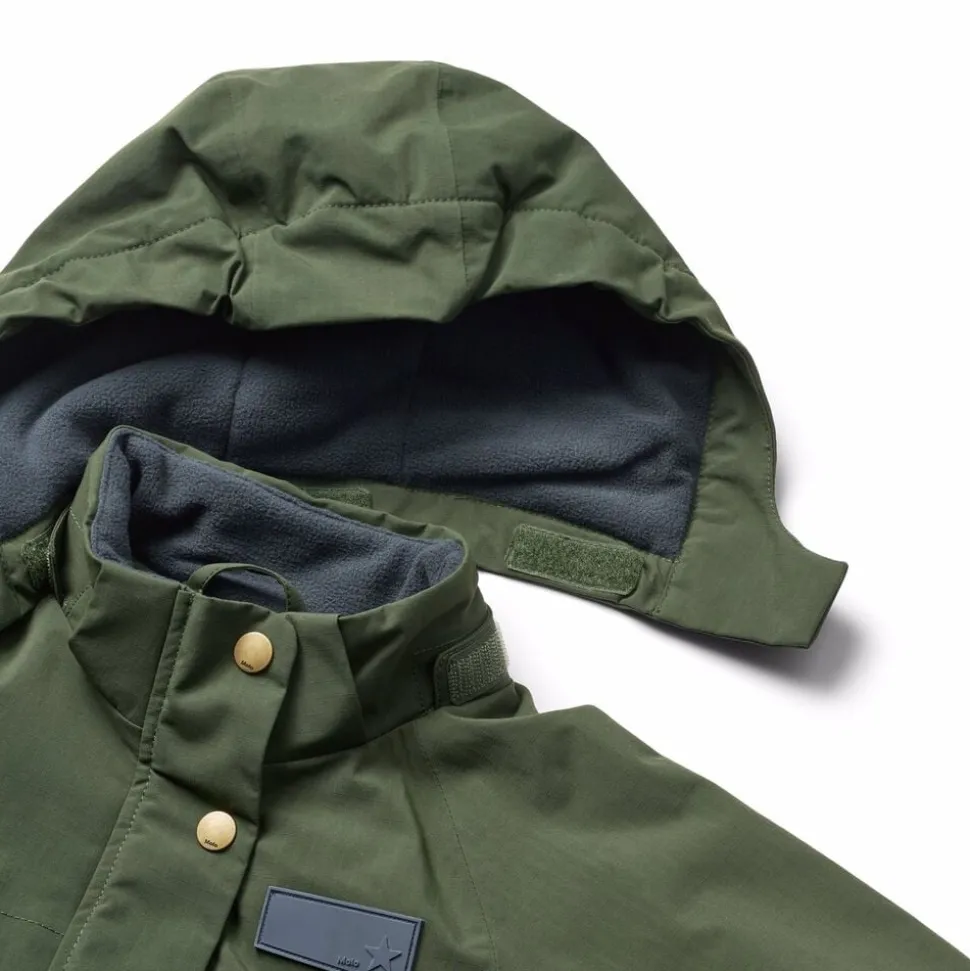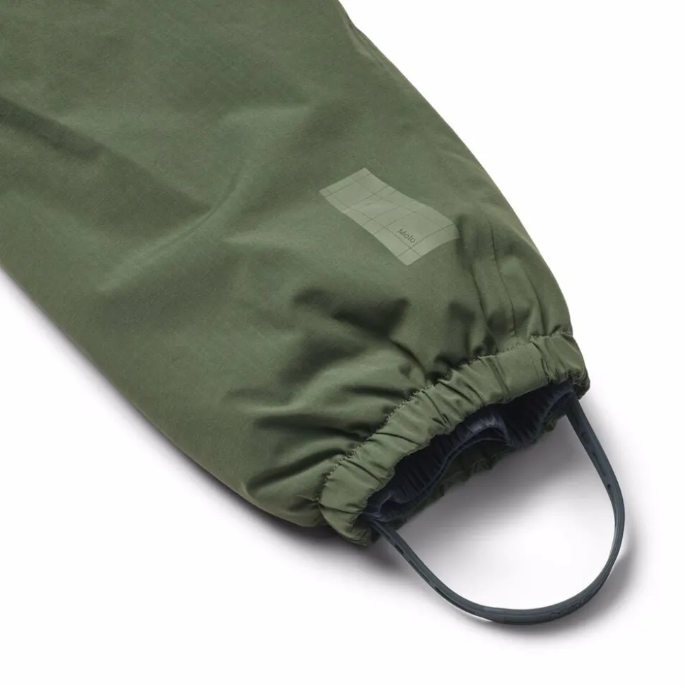 Denne vandafvisende mørkegrønne flyverdragt fra Molo er lavet i genanvendt nylon. Den har en aftagelig, foret hætte og en lang lynlås på fronten med overfald, der gør den nem at tage af og på. Elastikken i lænden samt ved ærmer og benåbninger holder sne, regn og vind ude, samtidig med at luffer og støvler bliver på plads. Dragten har desuden en indvendig justerbar elastik i taljen for en tæt pasform omkring kroppen.