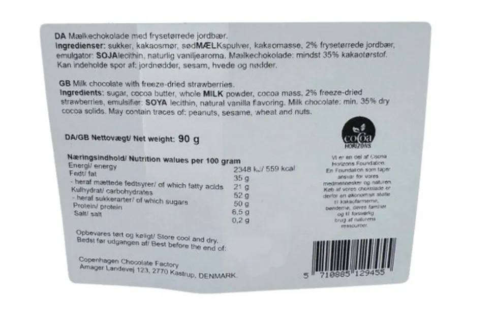Mælkechokolade fra Magasin Chokolade toppet med knasende frysetørrede jordbær