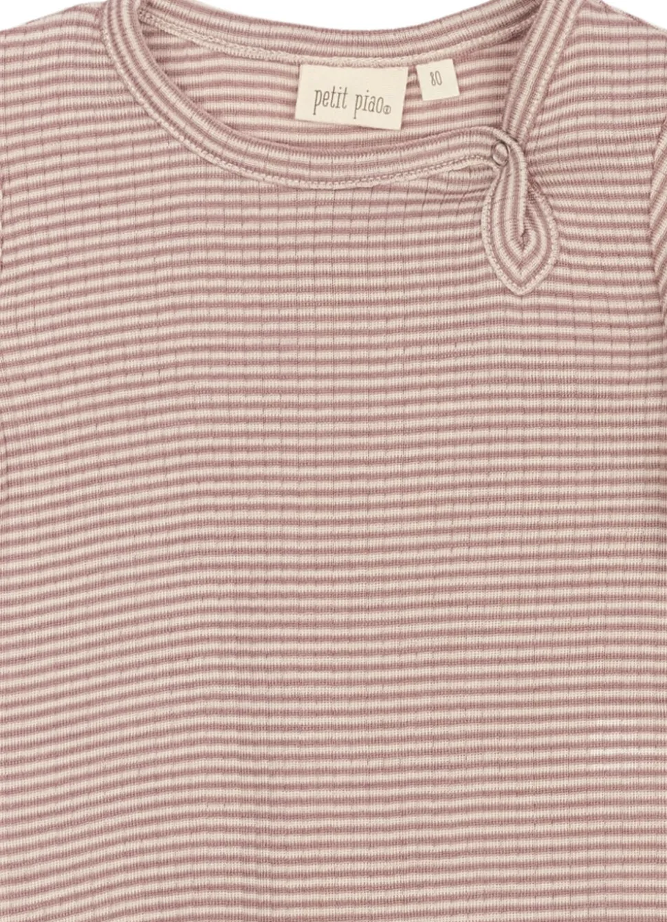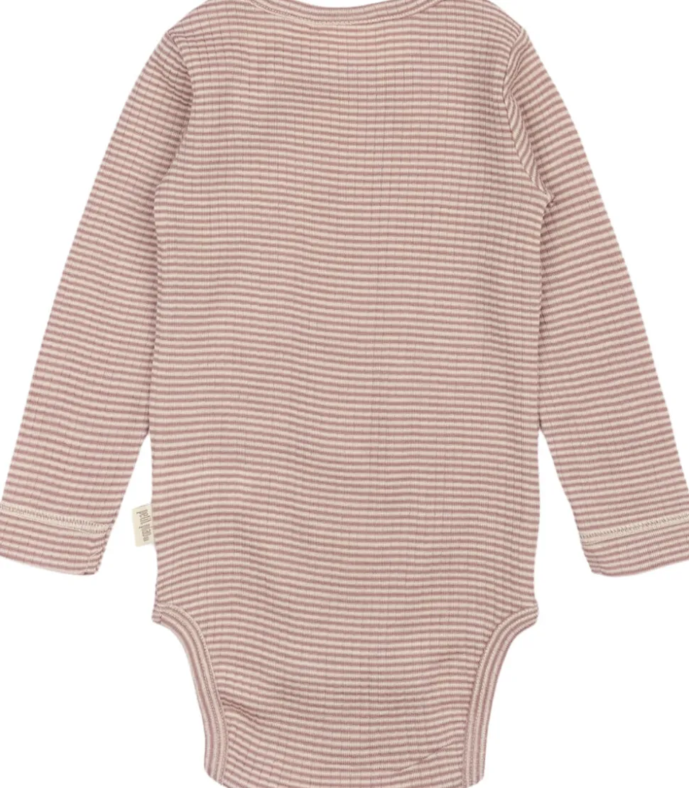 Langærmet body lavet i merinouldskvalitet med smukke striber. I venstre side af halsåbningen har vi vores signaturlukning med en trykknap for nem åbning. Bodyen lukkes i bunden med tre trykknapper, for nem ble-skift. Materiale er blødt og meget strækbart, lavet til komfort og leg. Produceret i Indien.
