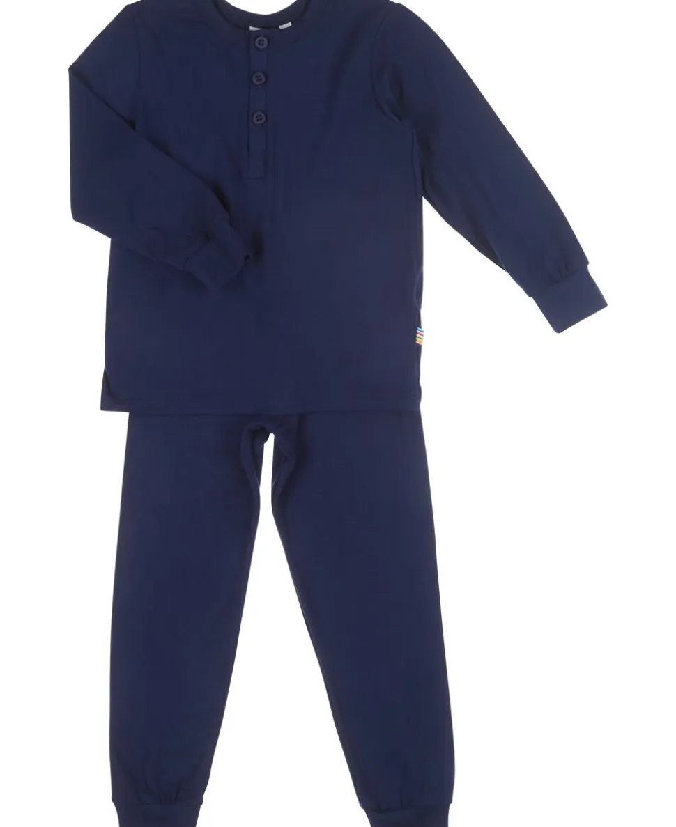 Pyjamas sæt. Bluse i A-facon og med lange ærmer. Piquette stikning i halsen som sød detalje. Bukser med blød logo elastik i taljen. Hele sættet er i en dejlig blød og elastisk viskosekvalitet med bambus og som der er behagelig at have på. Ensfarvet.