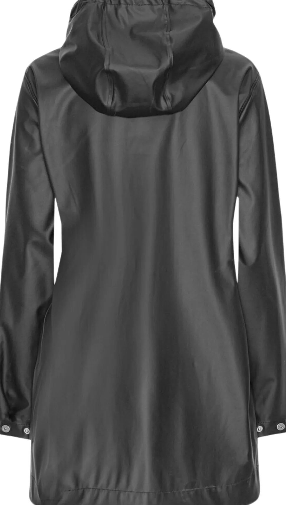 Denne nye, moderne garderobeklassiker er en regnfrakke med lige pasform i slidstærkt, let, gummibelagt, vandtæt PU-belagt stof. Den er fremstillet af eksperter og skræddersyet med svejsede sømme for komplet beskyttelse mod regnen og med en Recycled tricot-bagside for komfort. Hætten med snoretræk med bomuldslook og snørehuller under armene giver bevægelsesfrihed og komfort i ubehageligt vejr. Denne kvalitet tilbyder vejrbeskyttelse med en vandtæt klassificering på 5000 mm.