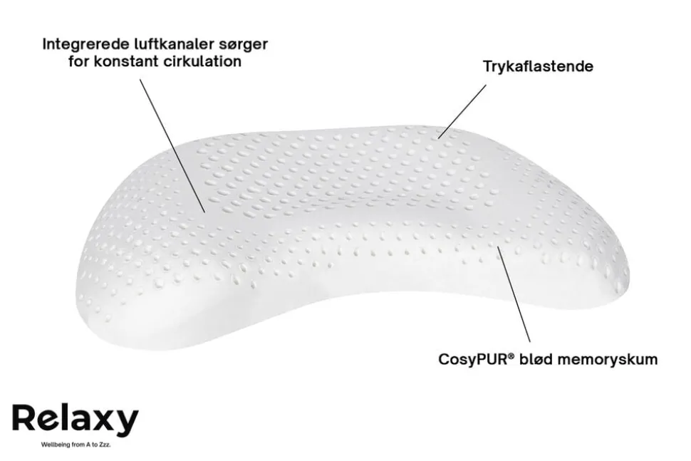 Den måneformede pude er fremstillet af blød og trykaflastende viscoelastisk skum, som yder støtte alle de rigtige steder. Puden har en hul midte, som sørger for solid og komfortabel støtte og hvile til hovedet. Det er den ultimative pude til dig, der sover på siden, da den også giver god støtte til nakke og rigelig plads og ingen belastning til skuldrene.