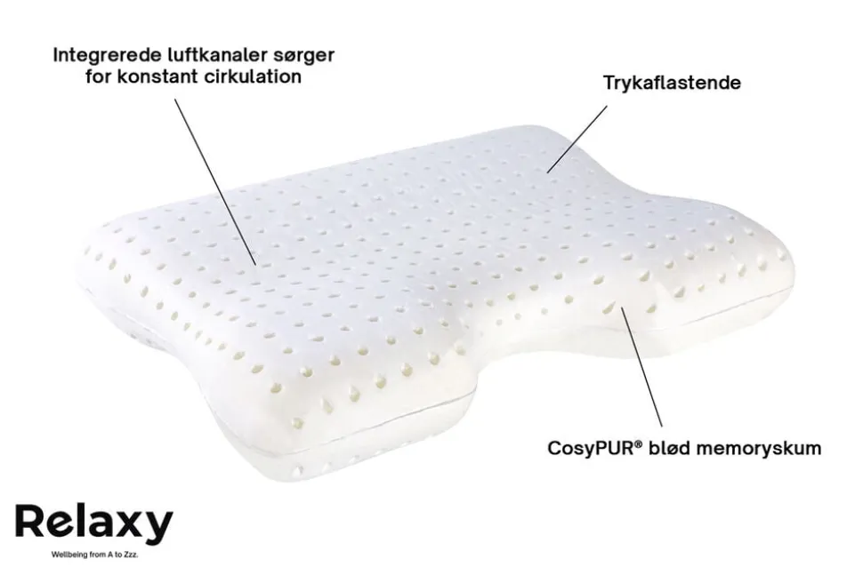 Relaxy WAVE Puden er puden, som sørger for en blid og rolig søvn uden afbrydelser. Dens specialdesignede, bølgede form giver plads og støtte til nakken, samtidigt med at den løfter hovedet en anelse, hvilket giver luftvejene den bedste position, så du ubesværet kan trække vejret uden snorken eller andre gener.