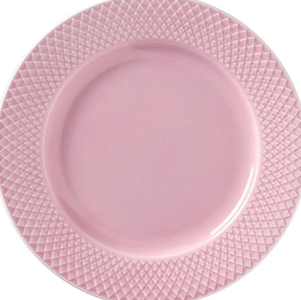 Der er endeløse kreative muligheder og farverne i Rhombe Color har en dyb farvemæthed, der vækker følelser og forstærkes af de varme toner. Farverne er udvalgt i et samarbejde med designduoen Stilleben. Rhombe-mønsteret stammer fra Lyngby Porcelæns arkiver og så første gang dagens lys tilbage i 1961. På den fine Rhombe-frokosttallerken i håndlavet porcelæn er mønstret ikke ligesom dengang overført på porcelænet som et mønster, men brugt som relief. Dette giver tallerkenen et simpelt og klassisk udtryk, der pryder borddækningen til både hverdag og fest. Middagstallerkenen er vist i farven rosa. Rhombe middagstallerken har 2 års brudgaranti.