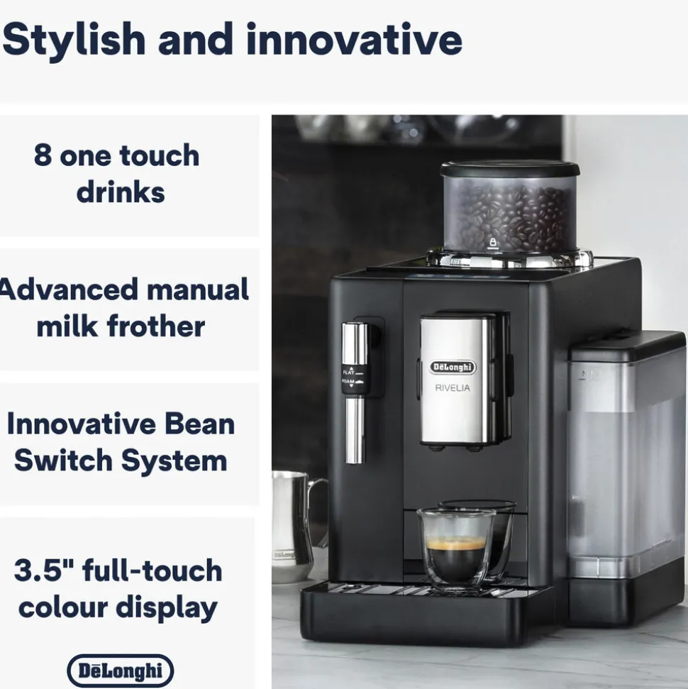 Dyk ned i kaffens univers med Rivelia og udforsk en mangfoldighed af bønnevarianter ved hjælp af Bean Switch System. Nyd en luksuriøs kaffeoplevelse gennem det 3,5″” fuld-touch farvedisplay, der præsenterer levende animationer og skræddersyede kafferutiner. Den kompakte maskine, med manuel mælkeskummer, skaber cremet skum og tilpasser sig din personlige stil.Bean Switch System åbner døren til uendelige kaffesmage, hvor Rivelia leveres med to udskiftelige tragte på 250 g, så du let kan variere dine kaffesensationer. Brug Skift-tilstanden før udskiftning for at tømme kværnen for de nuværende bønner. Vælg mellem at brygge en kop kaffe eller male bønnerne til side, og skab en rig kaffeoplevelse skræddersyet til dig.Nyd det intuitive 3,5″” fuld-touch farvedisplay med rige animationer, der lærer din kafferutine at kende og tilpasser din menu i løbet af dagen. Med op til 4 brugerprofiler giver Rivelia en personlig kaffeoplevelse. Bean Switch System gør det nemt at udforske forskellige bønner, mens Bean Adapt-teknologien tilpasser kværnegrad, kaffedosis og infusionstemperatur til dine valgte bønner.Mærk magien af 8 one-touch drikkevarianter via det intuitive display, og skab lækkert, cremet mælkeskum manuelt til at fuldende dine mælkebaserede drikke. Alt dette præsenteret i et elegant og kompakt design med bløde kanter, der oser af Sort Onyx.