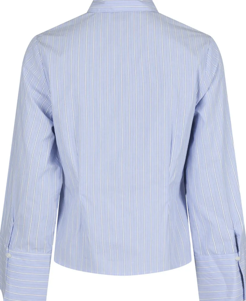 Stribet skjorte med lange ærmer. Skjorten har en klassisk krave, brede ærmer og lukkes med knapper langs fronten. Den er lavet i bomuld og har en tætsiddende pasform. Modellen er iført størrelse 36.