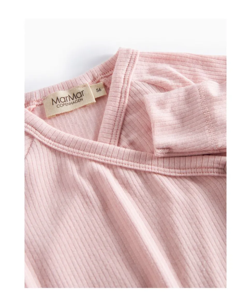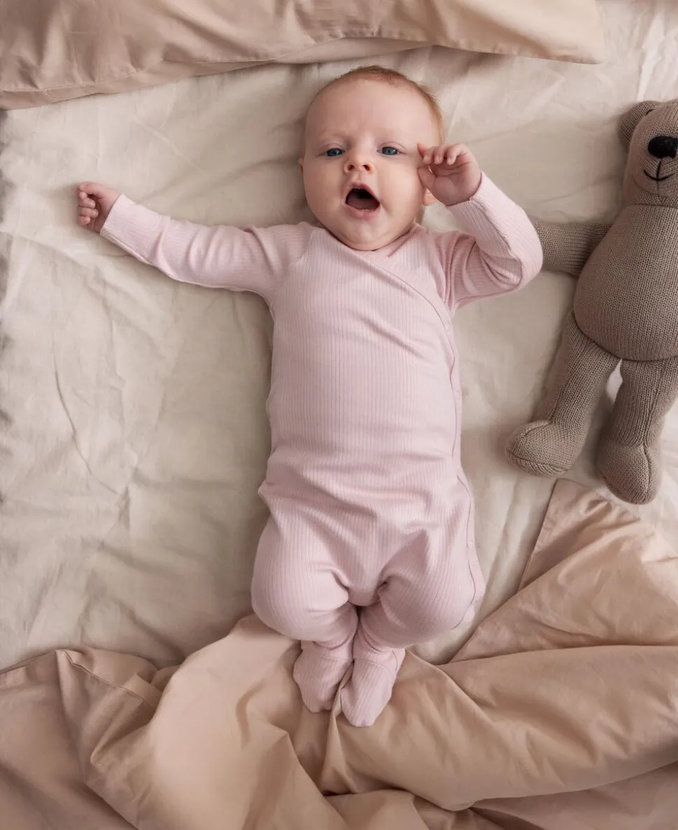 Langærmet baby modal bodystocking med stolpe knaplukning, der bliver lukket med trykknapper mellem benene for nem bleskiftning. Bodystockingen er både ribstrikket, blød, holder form og farve og har elastan i sig som gør den strækbar og behagelig at have på.