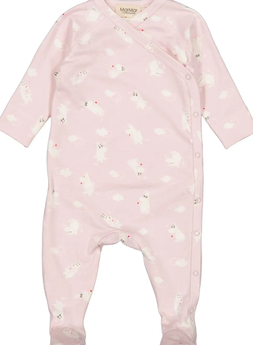 Langærmet heldragt med fødder til de mindste i et sødt delefin print. Heldragten har slå-om-lukning og lukkes med trykknapper fra halsen og ned langs det ene ben. Heldragten er både blød, strækbar og behagelig at have på.