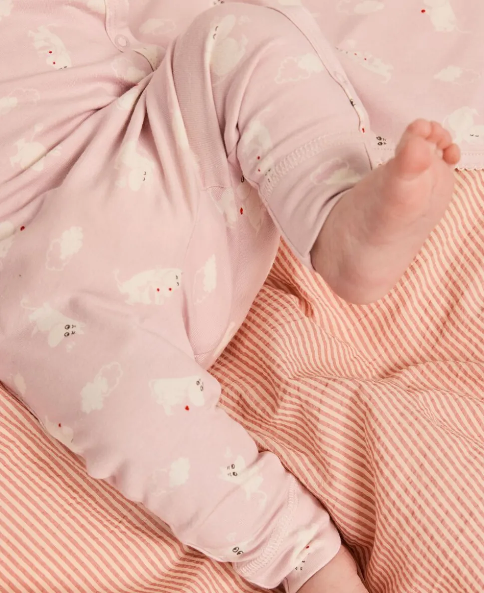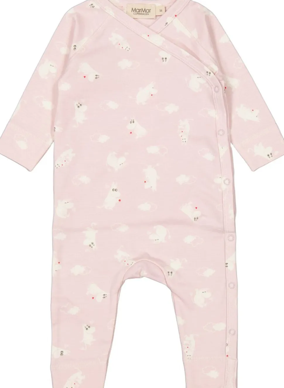 Langærmet heldragt med slå-om-lukning til nyfødte. Heldragten har et fint Moomin print. Heldragten lukkes med trykknapper fra halsen og ned langs det ene ben og er både blød, strækbar og behagelig at have på.