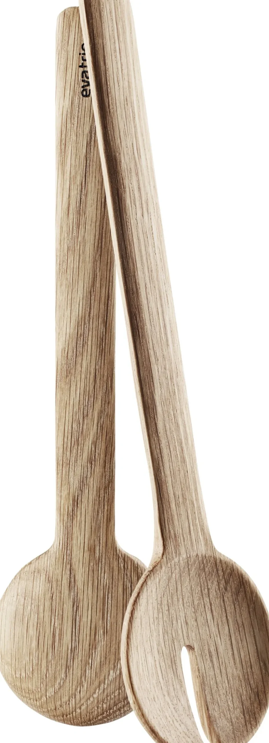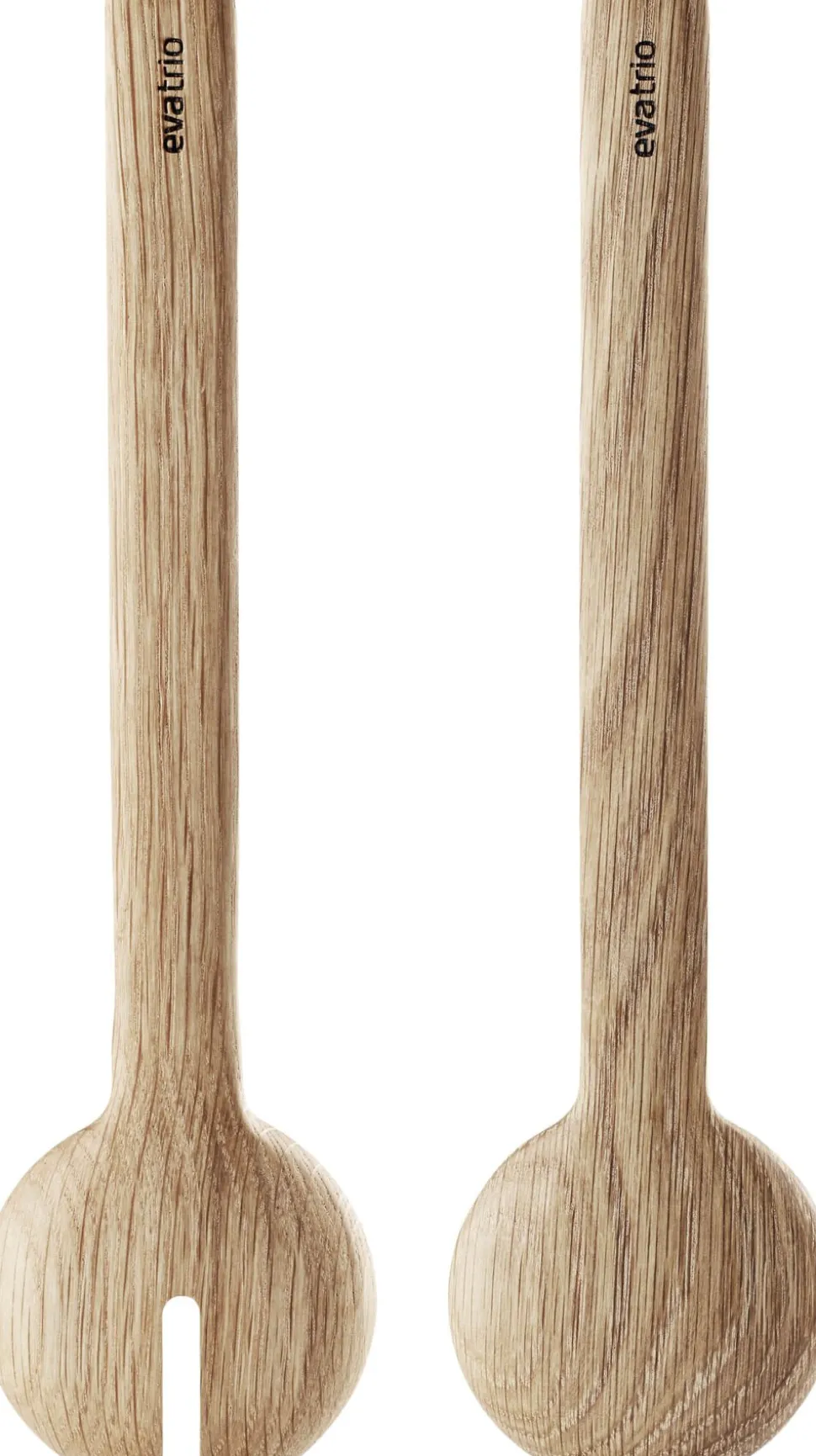 Salatsæt fra Eva Trio er både elegant og råt på samme tid. Det er skåret i eg, som giver hvert enkelt salatbestik et helt unikt og nordisk udseende. Sættet er designet med bløde former, som sikrer et godt og komfortabelt greb.