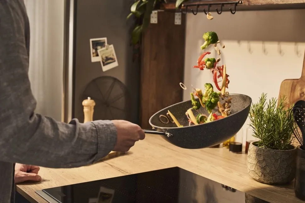 Mere robusthed for mere lethed. Med BALLARINI Salina Wok møder italiensk passion asiatiske aromaer. I den forbindelse kan man stole på en keramisk belægning af næste generation: CERAFORCE TITANIUM Udstyret med en ekstra robust basis af hård titanium er den op til fem gange mere holdbar end vores tidligere keramiske belægninger*. Samtidig giver den dig fremragende nonstick-egenskaber: Også med mindre fedtstof er det nemt at lave lækkerier. Især fordi den massive aluminiumskerne med innovativ Radiant-induktionsbund leder varmen særligt jævnt ud til kanterne af wokken. Det kølige håndtag i rustfrit stål med stay cool-funktion sikrer altid en behagelig og sikker håndtering. Molto bene!