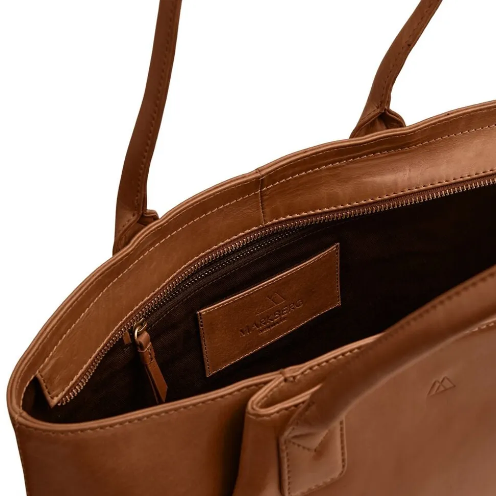 Opdag Saya Work Bag i Antique fra Markberg den ideelle følgesvend til den moderne, travle kvinde. Denne elegante arbejdstaske er skabt i 100% kalveskind med fokus på zero waste, så intet skind går til spilde. Tasken er i vegetabilsk indfarvet læder, baseret på naturlige materialer. Teksturen og farven kan variere, hvilket er læderets naturlige karakteristika. Denne lædertype får patina i takt med at den bruges. Det stilrene design prydes af Markbergs karakteristiske signaturaftryk på fronten, som samtidig fungerer som en praktisk åben lomme lukket med magnetisk tryklås for nem adgang. Den rummelige frontlomme er perfekt til dine vigtigste småting. Indvendigt byder tasken på et stort rummeligt hoved rum, der nemt rummer en 15” computer, samt en lynlåslomme på den ene side og en åben lomme på den anden perfekt til organisering. Gode håndtag gør det komfortabelt at bære tasken over armen eller skulderen. Taskens forring er i 100% bomuld, og målene er 29 cm x 41 cm x 12 cm den perfekte kombination af stil, funktion og bæredygtighed.