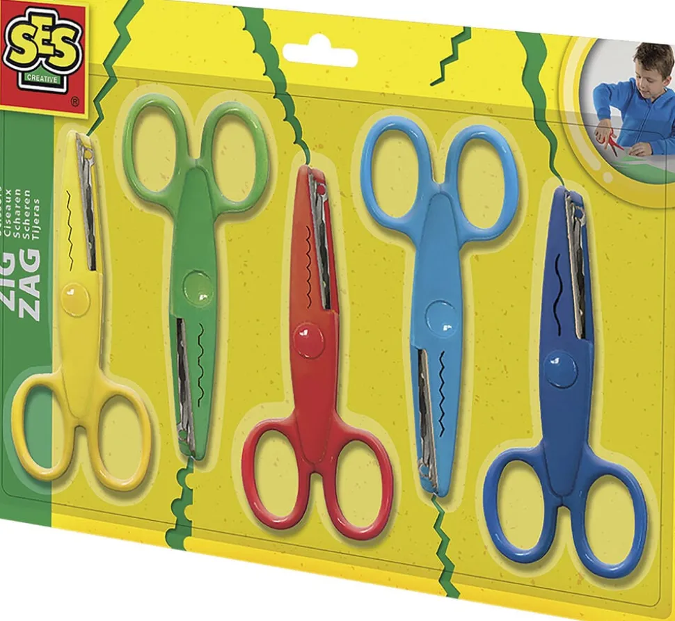 5 børnesakse som klipper forskellige zigzag mønstrer. Rustfri.