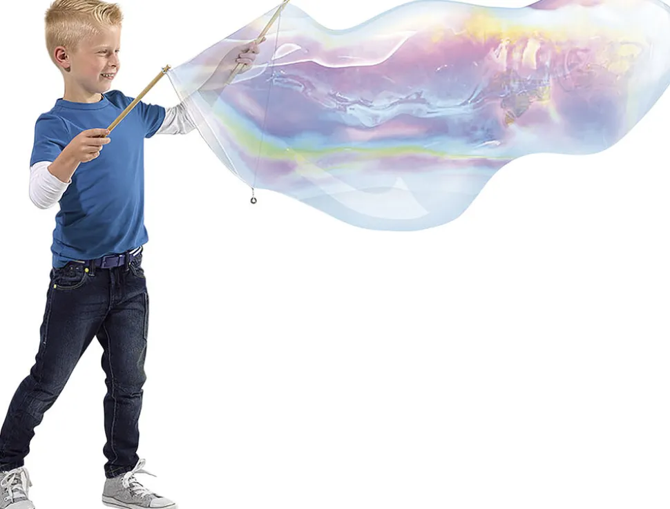 Nu kan du lave megastore bobler ved hjælp af håndværktøjet og en superstærk sæbeopløsning. Hold stængerne sammen, og dyp rebet i sæben. Løft stængerne op igen, og træk dem forsigtigt fra hinanden. Når du synes, boblen er stor nok, skal du sætte stængerne sammen igen. Nu har du en megaboble. Sæbeopløsning i flaske, 200 ml