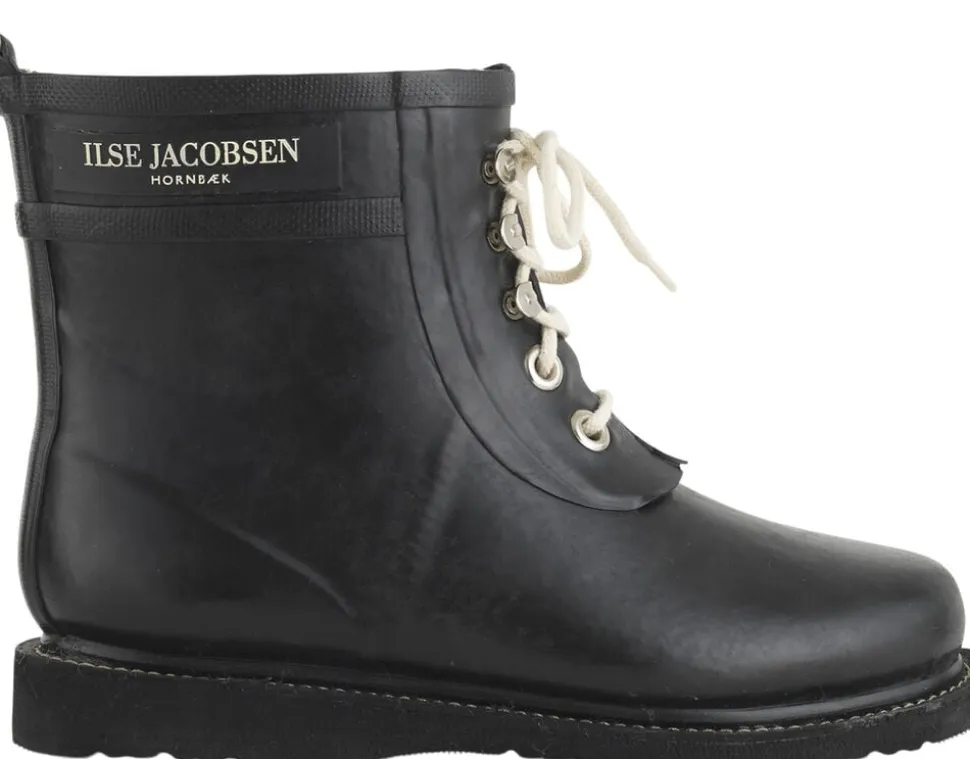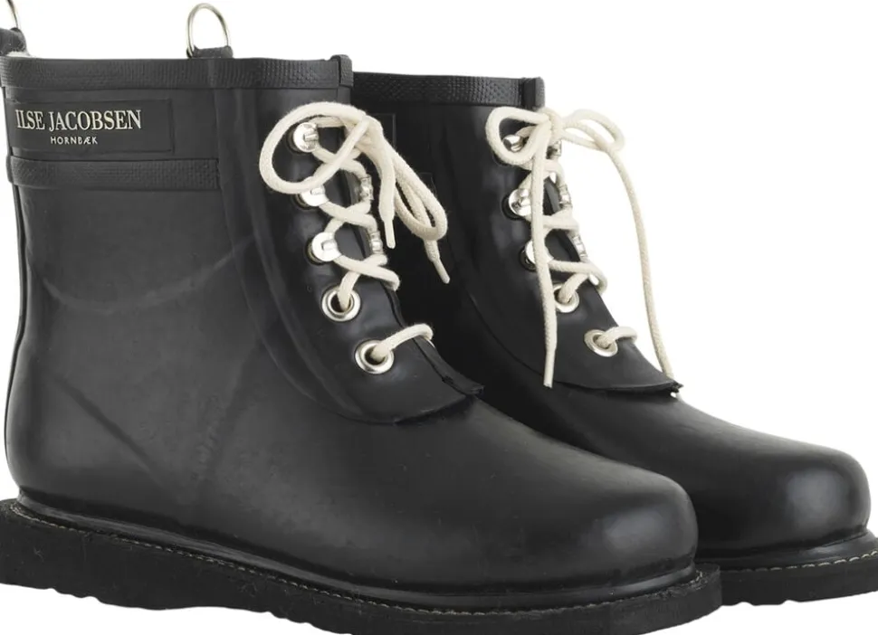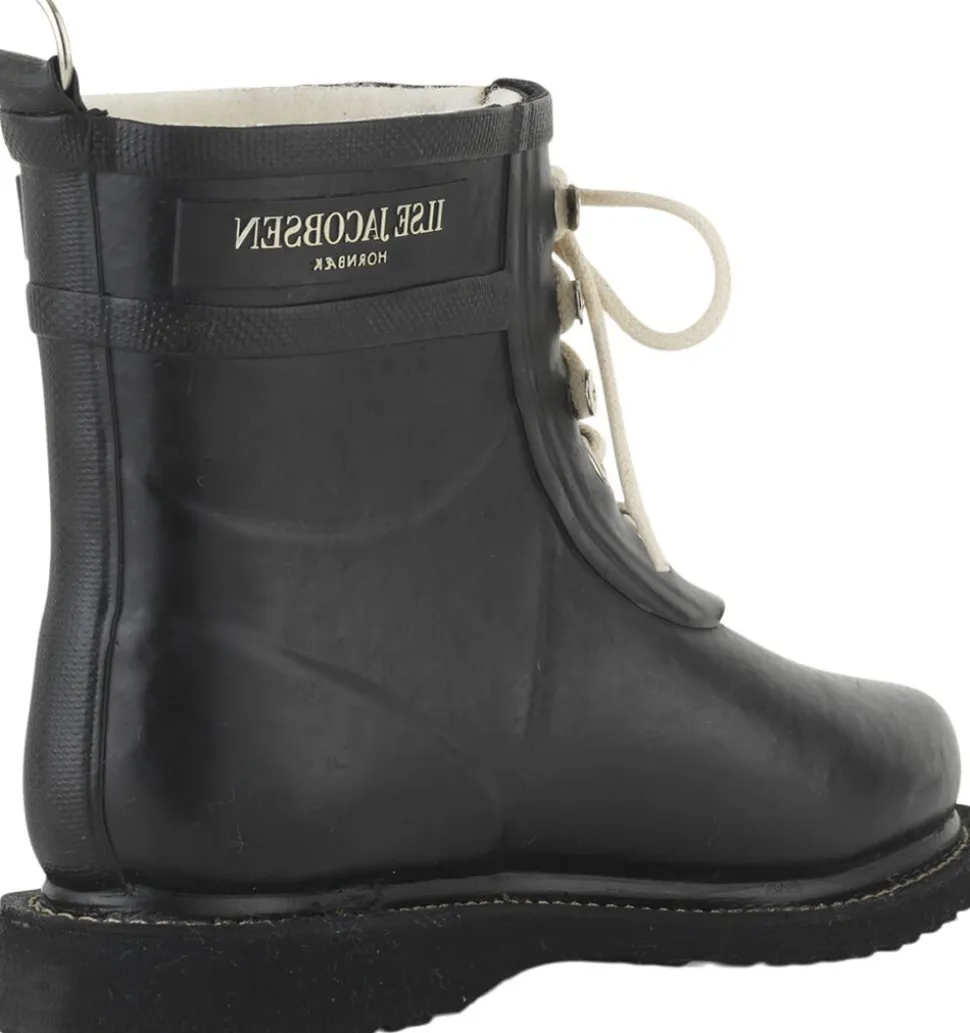 Korte gummistøvler med snørebånd fra Ilse Jacobsen findes på denne side med produktoplysninger. Disse støvler har en dekorativ D-ring midt bagpå og et logo på skaftet. De er fremstillet af bæredygtigt høstet naturgummi og er blevet skåret i hånden. Materialet kan modstå temperaturer ned til -20 grader celsius. Gummisammensætningen er 80 % ren, naturlig gummi og 20 % hemmelig formel. Støvlerne er helt PVC-fri og indeholder ingen animalske biprodukter. Over tid kan naturgummi udvikle en hvid overflade, hvis det ikke behandles regelmæssigt. Dette skyldes, at gummiet mister sin essentielle Olie. For at holde dine støvler i god stand i mange år fremover, anbefaler vi at behandle dem en gang om måneden med vores Olie. Nye snørebånd fås i flere farver