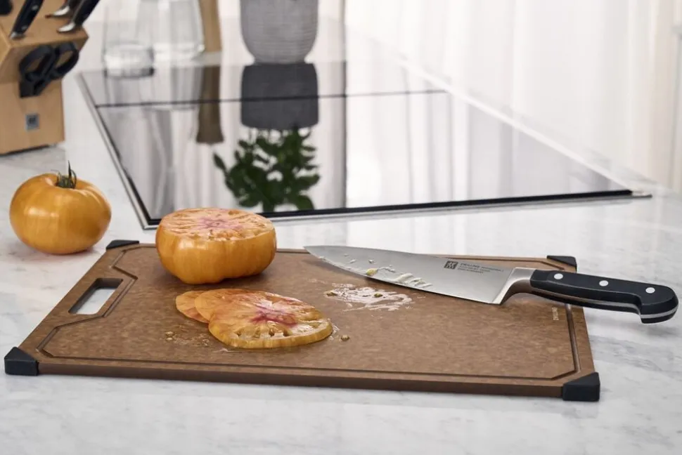 Opdag et uundværligt køkkenredskab: skærebrættet fra ZWILLING. Med det moderne design i elegant trælaminat tilføjer dette skærebræt både stil og funktionalitet til dit køkken. Den særligt tynde udformning gør det nemt at håndtere og pladsbesparende. Skærebrættet er skånsomt mod dine knive, da overfladen let får små snit ved brug. Det kan klare selv de hårdeste opgaver, da det er robust og varmebestandigt. Den praktiske saftkant på den ene side forhindrer, at væsker løber over, og sikrer en ren skæreoplevelse. Brættet tåler opvaskemaskine og er nemt at rengøre. De skridsikre silikonefødder sikrer et fast greb på enhver overflade, så skærebrættet altid står stabilt.