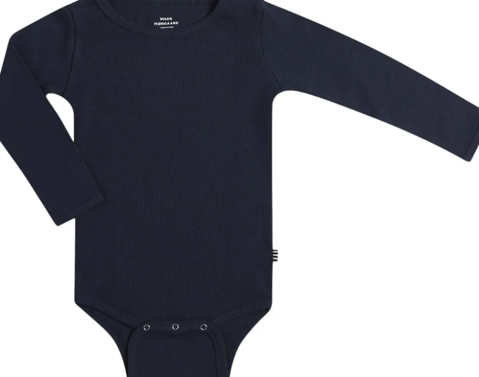 Body fra Mads Nørgaard-Copenhagen. Den har lange ærmer og trykknapper i kilen. En god basis body i 100% økologisk bomuld. Ribbet kvalitet.