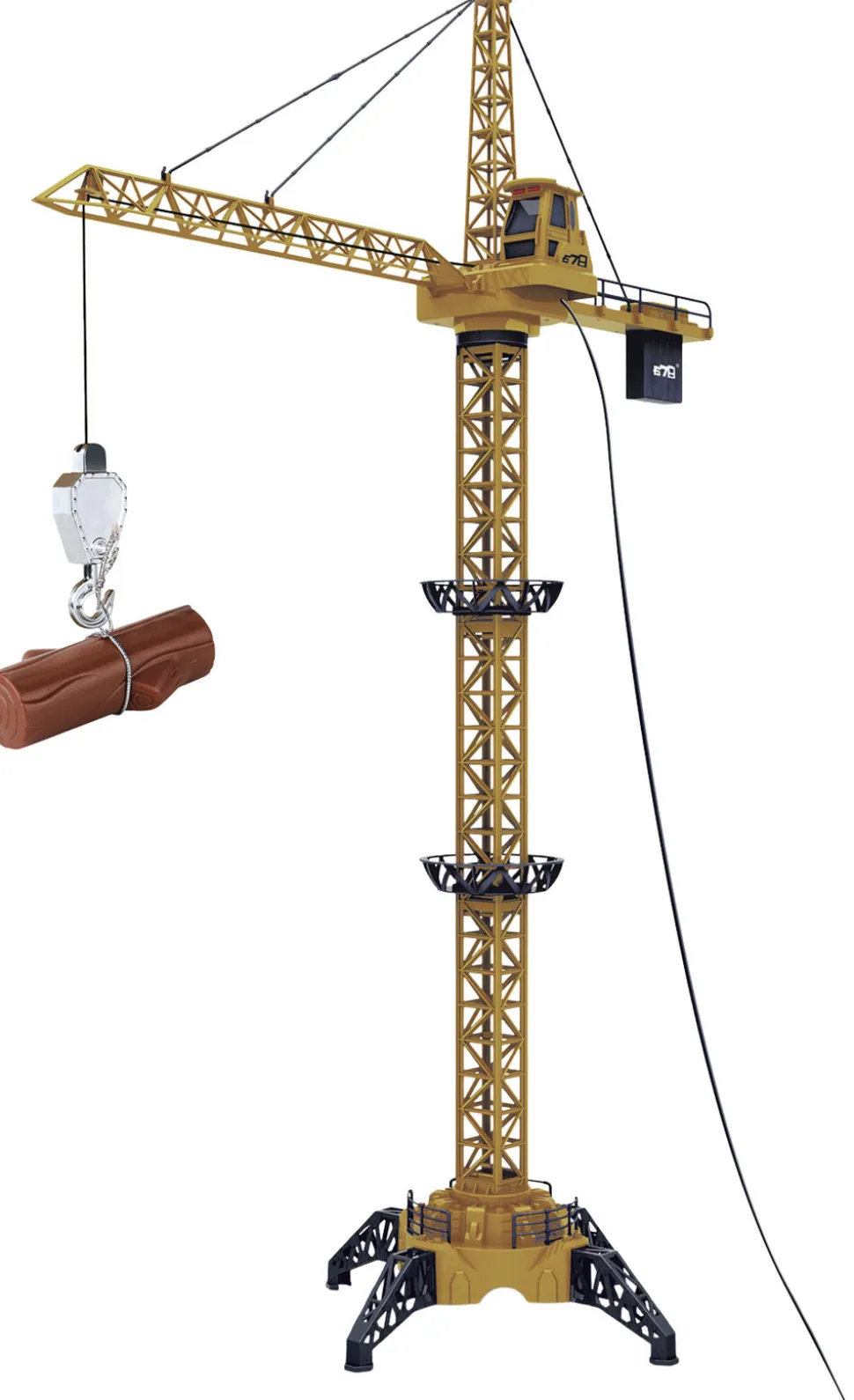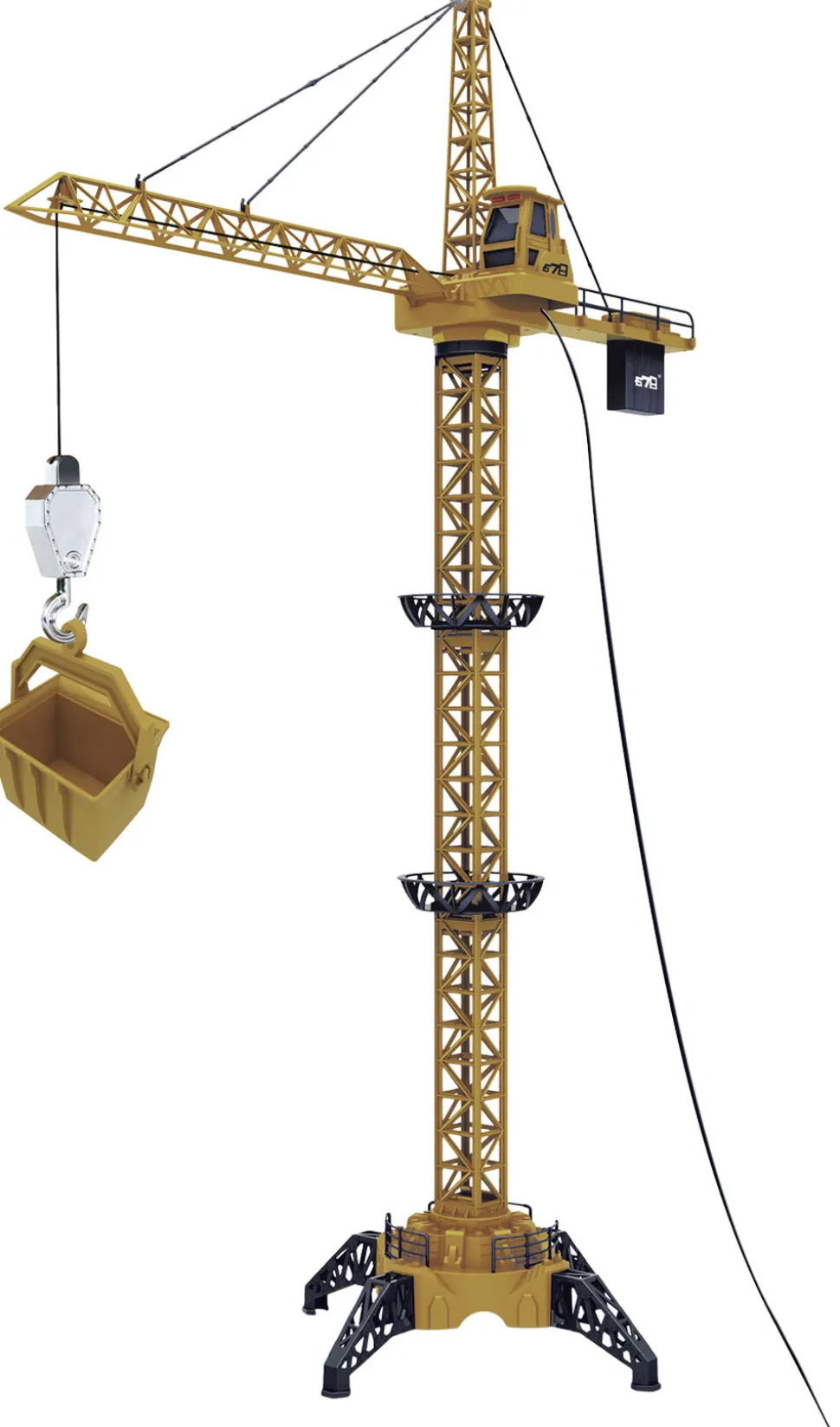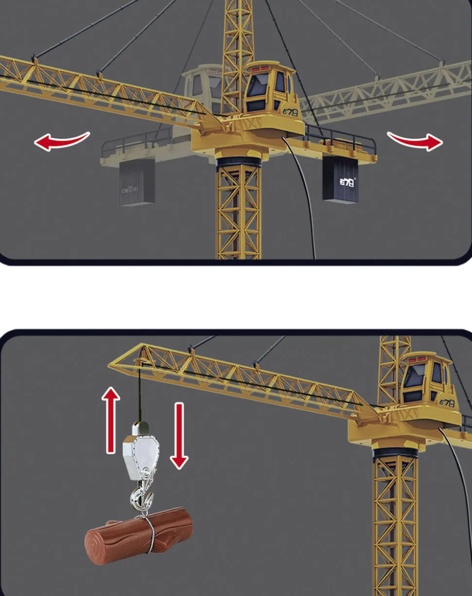Mega kran 1. 28 meter høj kabelstyret kran Kan dreje både til højre og venstre og hæve/sænke krogen Med lys i toppen når krogen hæves og sænkes Bruger 4 stk AA-batterier