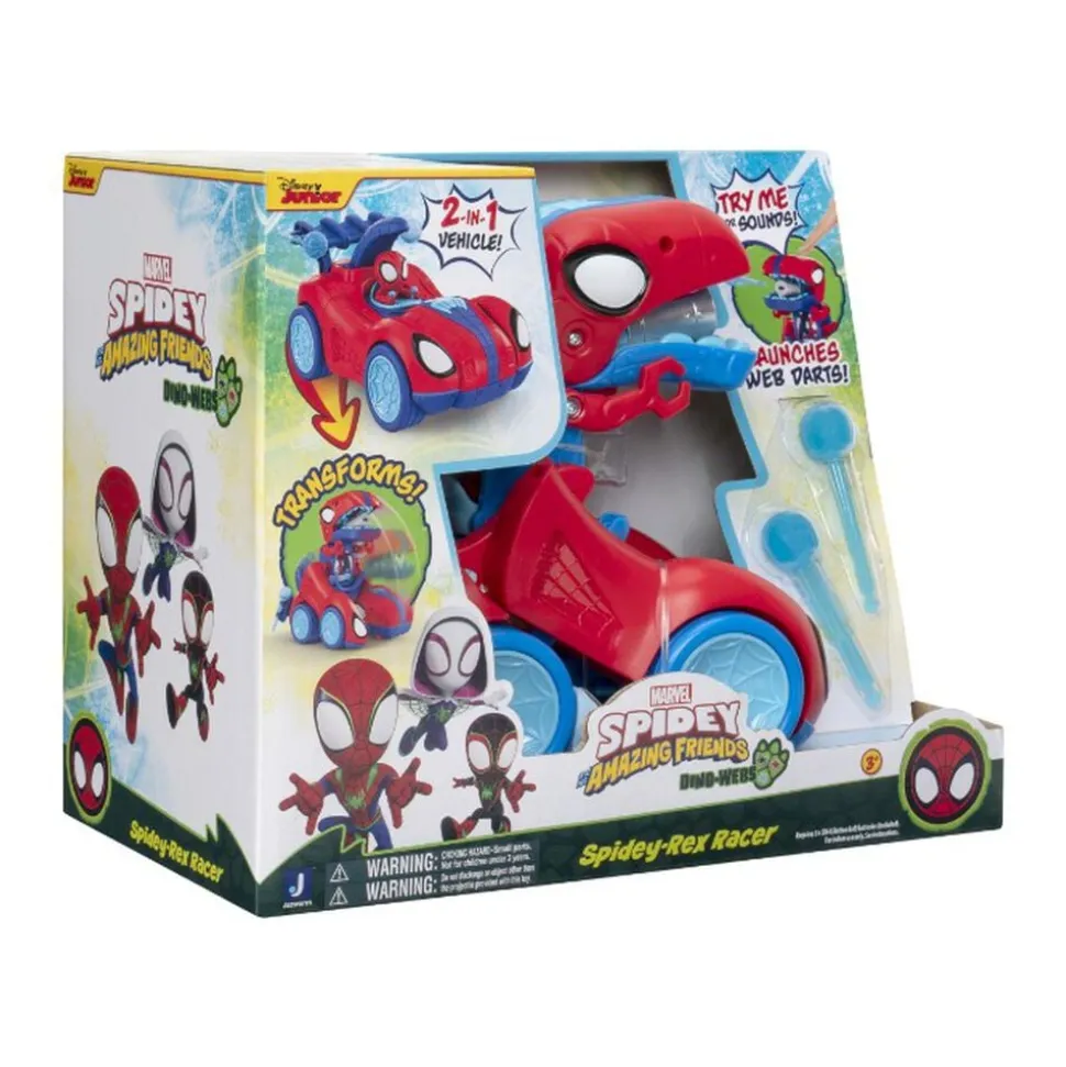 Rawh til undsætning med MARVEL Spidey og Hans Fantastiske Venner Spidey-Rex Racer Med den fantastiske Spidey bag rattet, transformeres dette 20 cm 2-i-1 køretøj fra et køretøj til den imponerende Spidey-Rex dinosaur Tryk på edderkop-ikonet for at aktivere lyde Træk derefter tag-håndtaget for at transformere køretøjet til Spidey-Rex og gør dig klar til action Tag web-dartsene og læg dem i Spidey-Rex mund Tryk på edderkop-ikonet igen, og Spidey-Rex vil affyre web-dartsene og a ktivere lyde Når faren er overstået, tryk på hovedet og Spidey-Rex vil transformeres tilbage til et køretøj Spidey-Rex Racer er inspireret af den populære tv-se rie Spidey og Hans Fantastiske Venner Officielt licenseret MARVEL-produkt fra Jazwares Indeholder: 1 x 20 cm Spidey-Rex Racer 1 x Web Dart Accessories 3