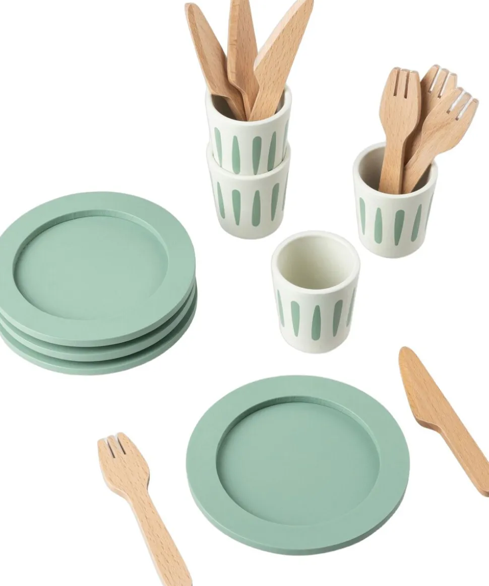 Det fine legespisesæt består af kop, tallerken, kniv og gaffel til fire personer. Sættet er fremstillet af certificeret træ og en del af Sebras køkkenunivers, der også indeholder køkkenredskabssæt, gryde- og pandesæt samt tesæt. Alle delene passer desuden til KiDchen-legekøkkenet, der består af tre moduler.