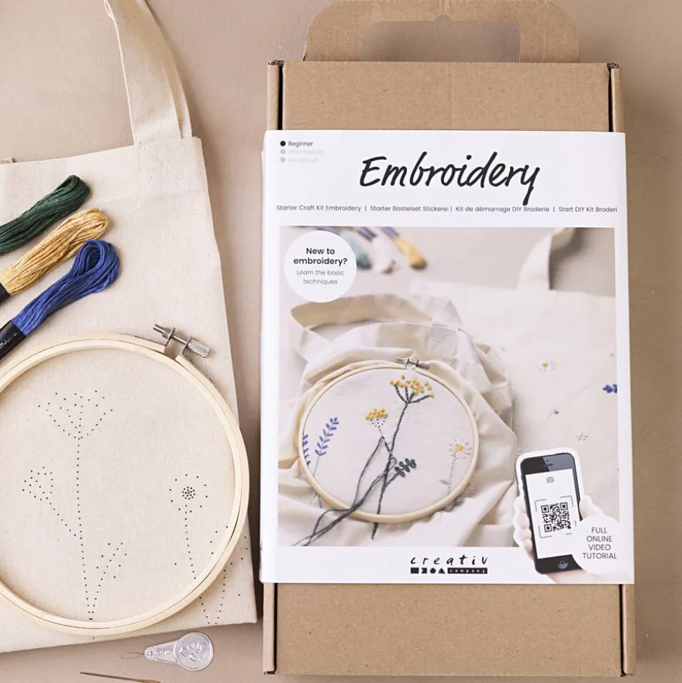 Med dette kit kan du lære at brodere. Indeholder alle de materialer du skal bruge, og al den vejledning du behøver. Vil du lære at brodere, er vores Start DIY Kit helt perfekt. Det indeholder alt, hvad du skal bruge for at komme godt i gang. Scan QR-koden, og bliv ført ind i vores læringsunivers fyldt med videoer, som er klar til at guide dig. Du vil lære forskellige basiselementer og teknikker indenfor brodering, og til sidst vil du stå med to muleposer med broderede motiver på.