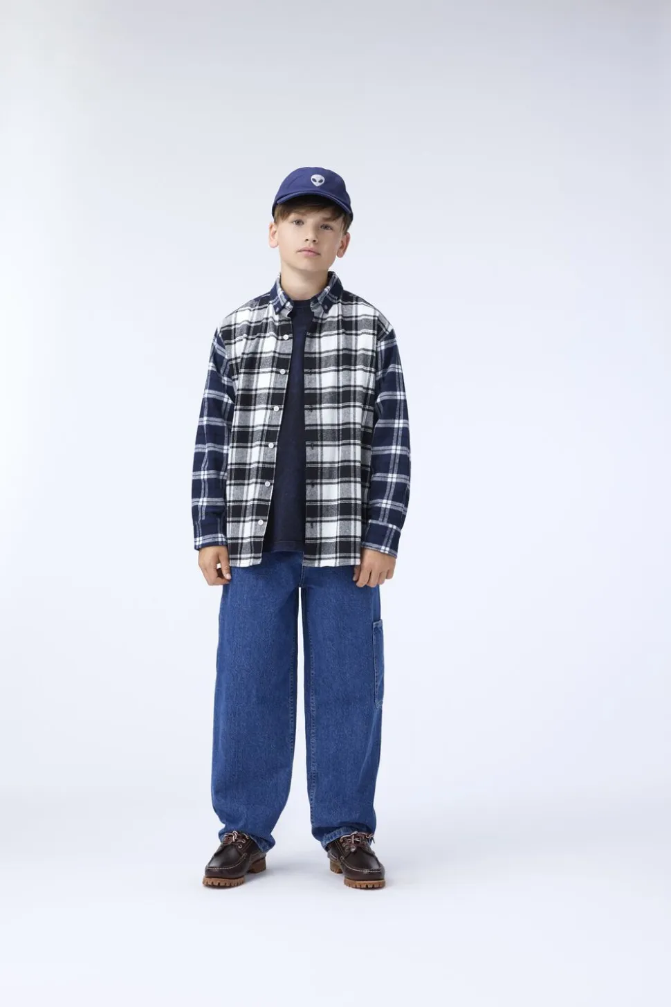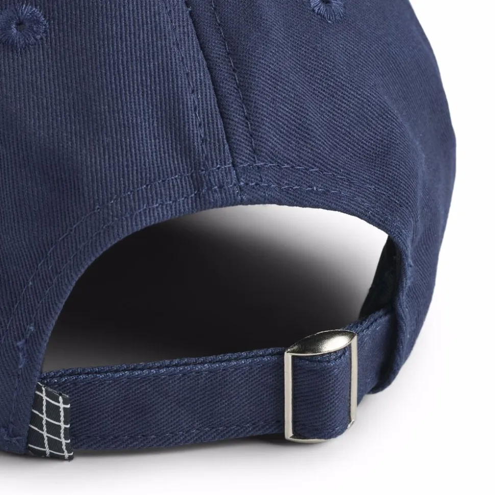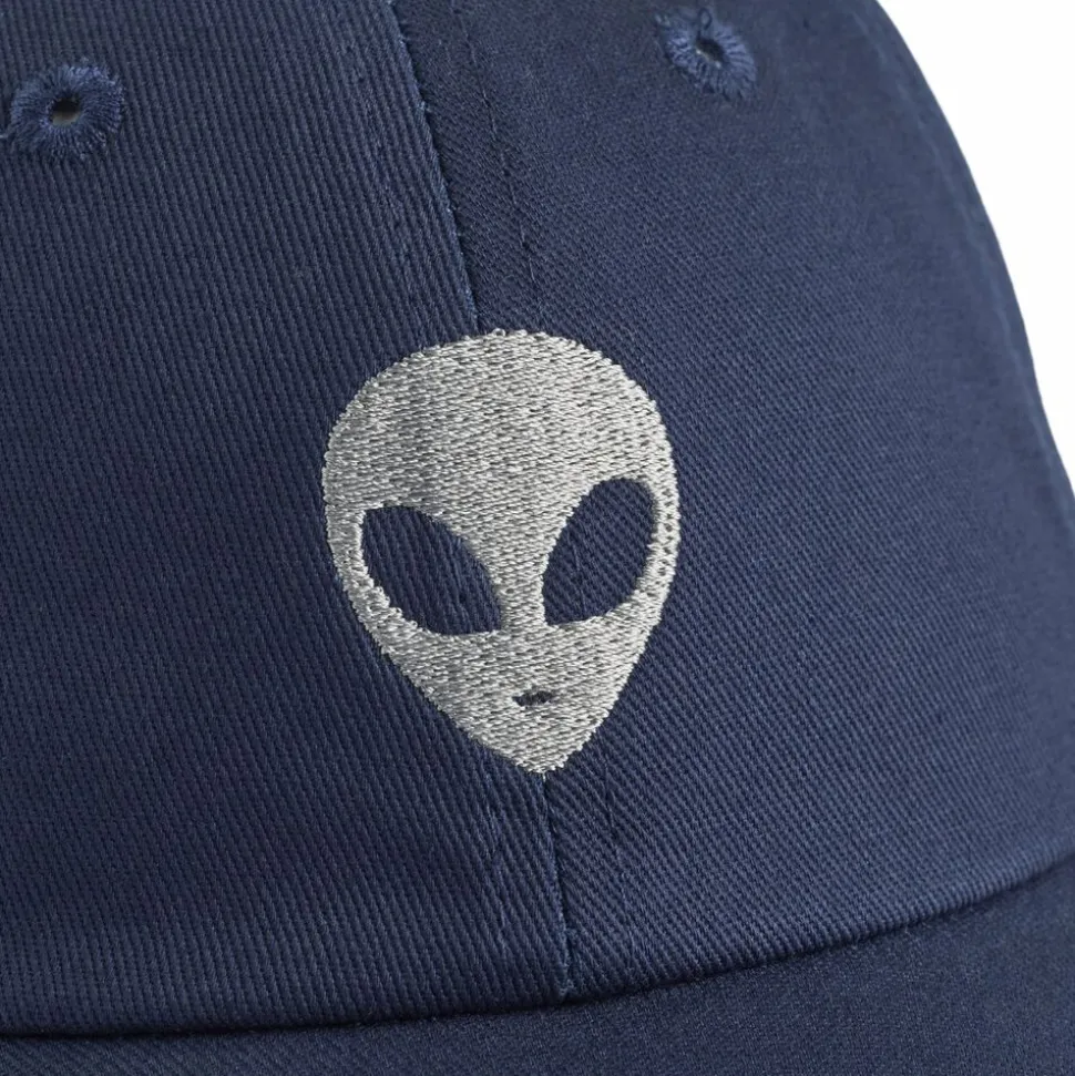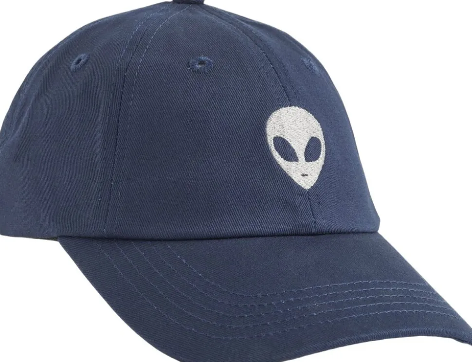 Mørkeblå kasket fra Molo i bomuld med et sølvbroderi af en alien foran, en let bøjet skygge og en justerbar lukning i nakken.
